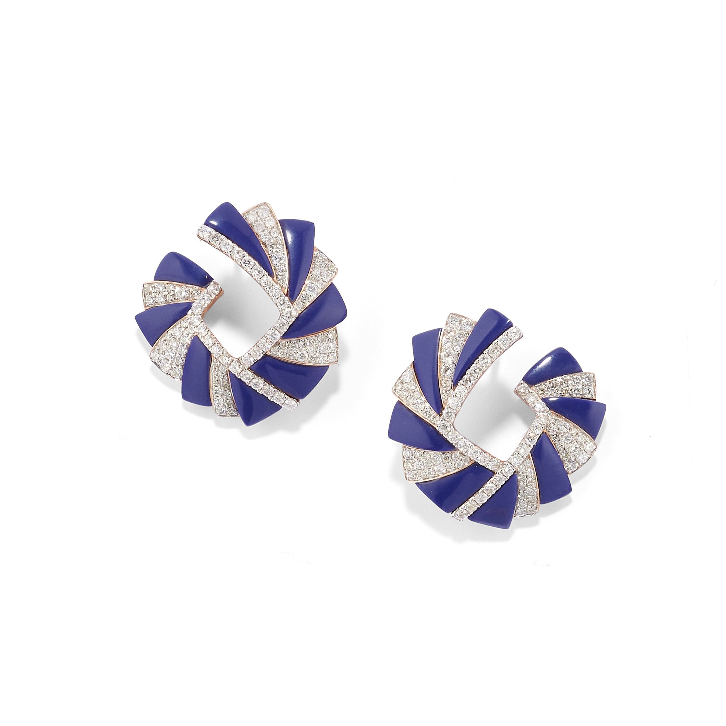 a ventaglio, con inserti in lapislazzuli e diamanti taglio brillante per totale ct 2,00 circa, chiusura perno e farfalla.