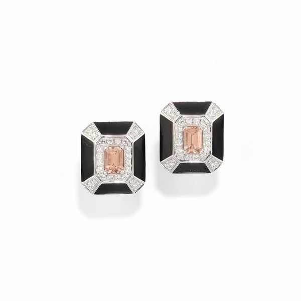 a disegno ottagonale, al centro morganite di forma rettangolare a contorno ottagonale di ct 1,40 circa, diamanti taglio brillante per totale ct 0,70 circa e smalto nero, chiusura perno e clip.