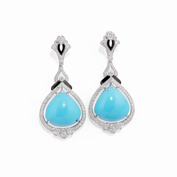 con turchesi naturali taglio goccia cabochon, decorati da diamanti taglio brillante per totale ct 2,20 circa e smalto nero, chiusura perno e farfalla.