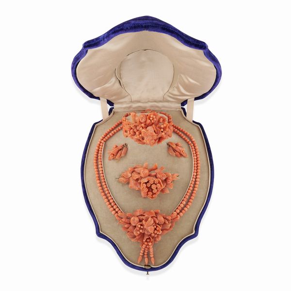 Fine XIX inizi XX secolo composta da collana, bracciale, spilla e orecchini con chiusura a monachella, a motivo floreale, entro astuccio d'epoca, difetti (mancanze).