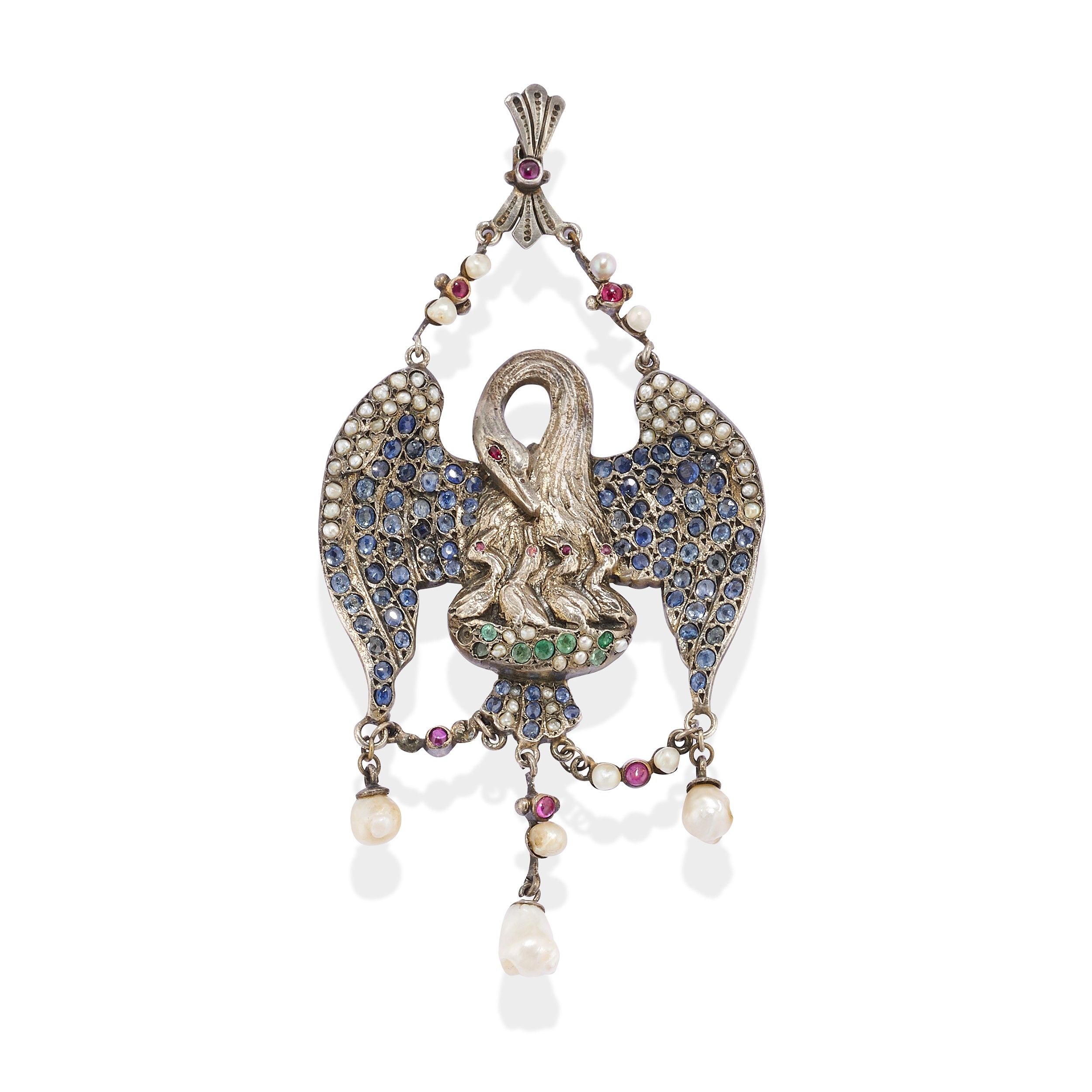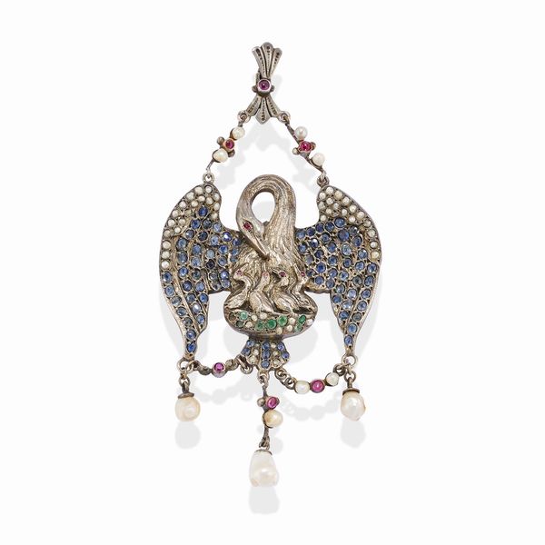 raffigurante cigni, decorato con zaffiri, smeraldi, rubini e perle prob. naturali.