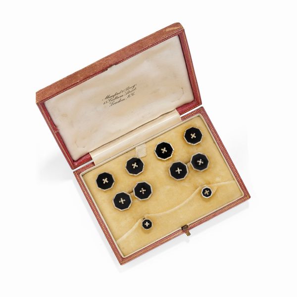 composto da una coppia di gemelli, quattro bottoni e due pin da giacca, di forma ottagonale con onice, con astuccio d'epoca.