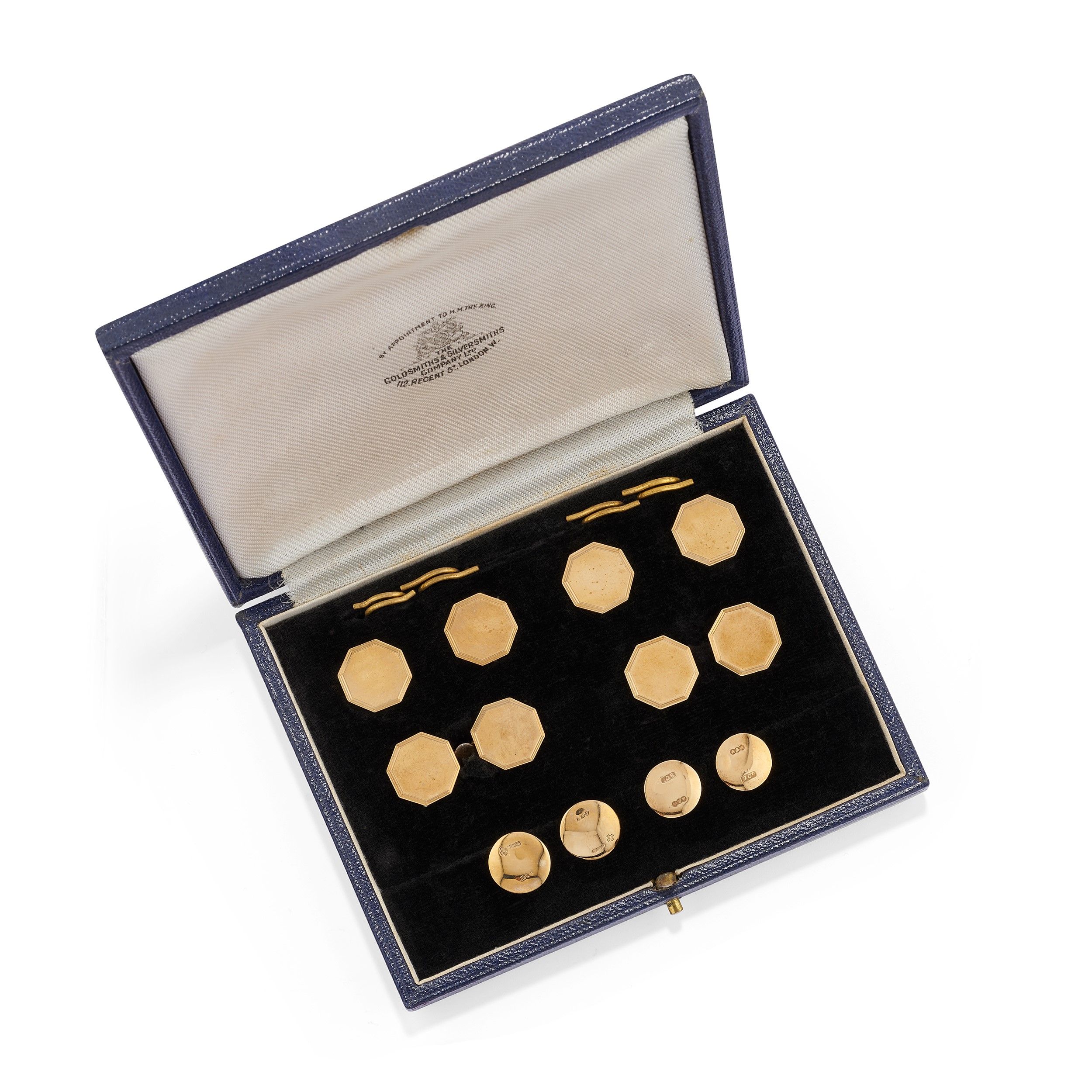 composto da coppia di gemelli, quattro bottoni e quattro pin, di forma ottagonale, con astuccio d'epoca.