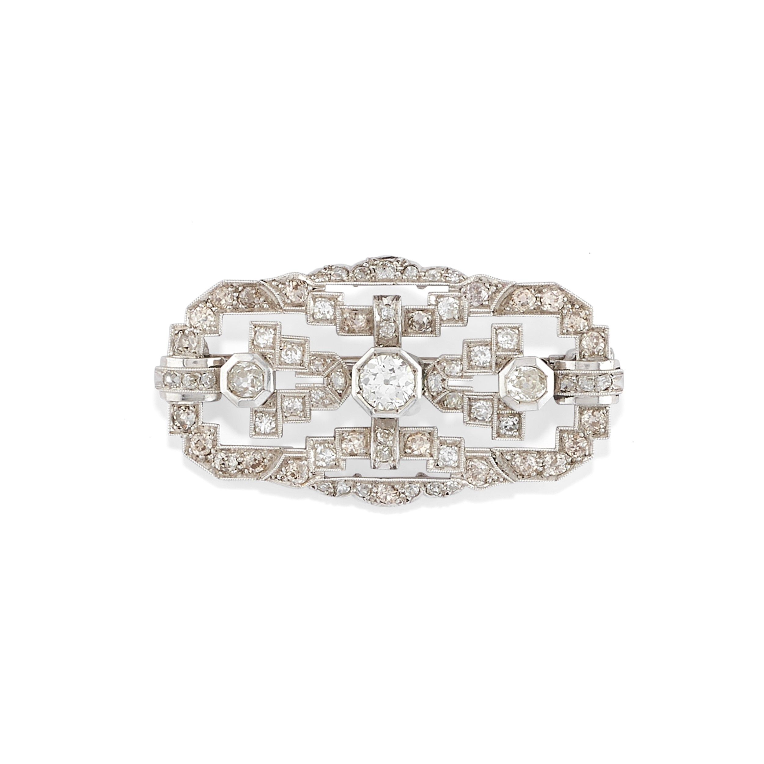 in platino, Peso g 14,70 cm 2,60x4,90 1930 circa a placca rettangolare lavorata a troforo centrata da tre diamanti taglio vecchio per totale ct 1,00 circa e contorno in diamanti taglio vecchio per totale ct 2,00 circa, difetti (piccola sbeccatura al diamante centrale).