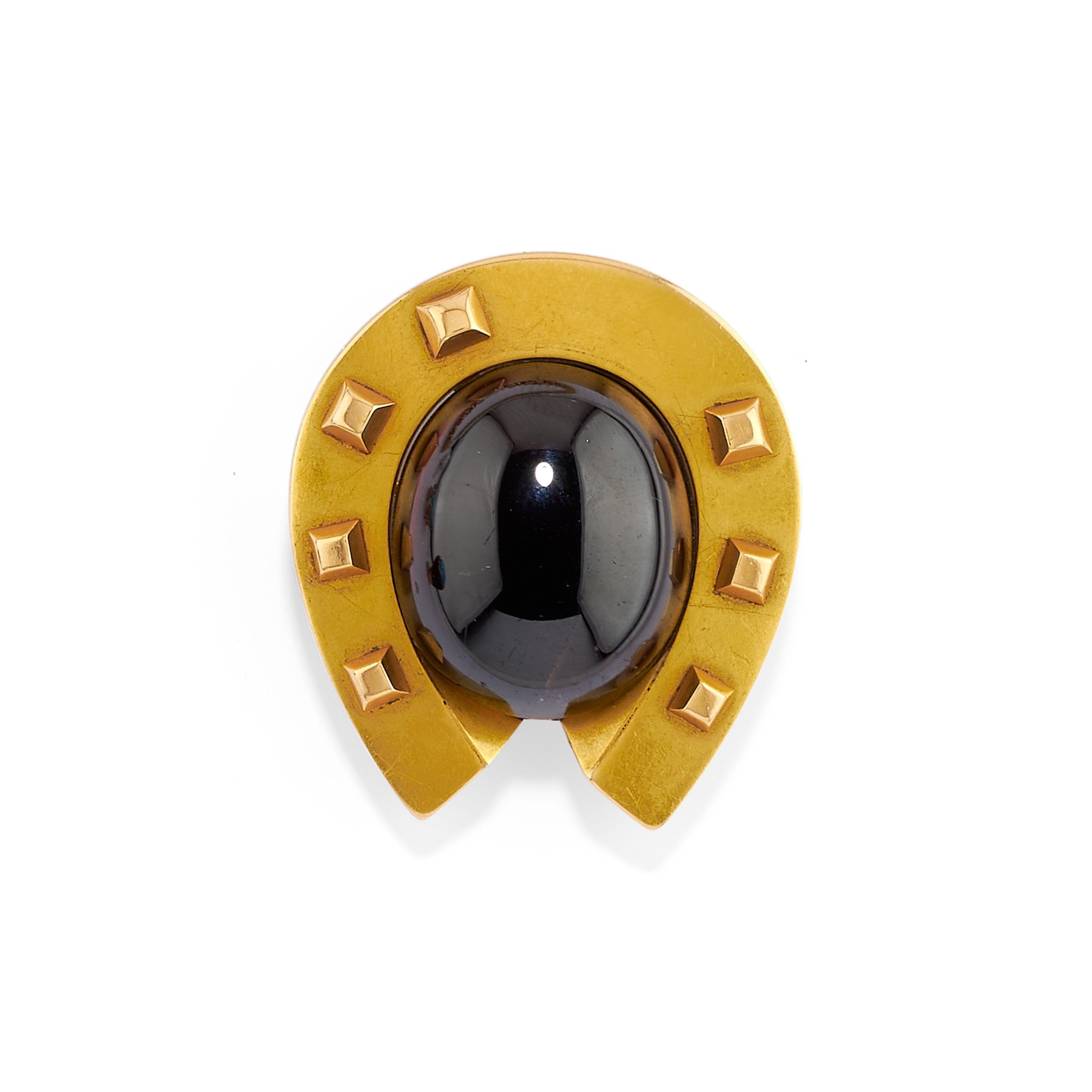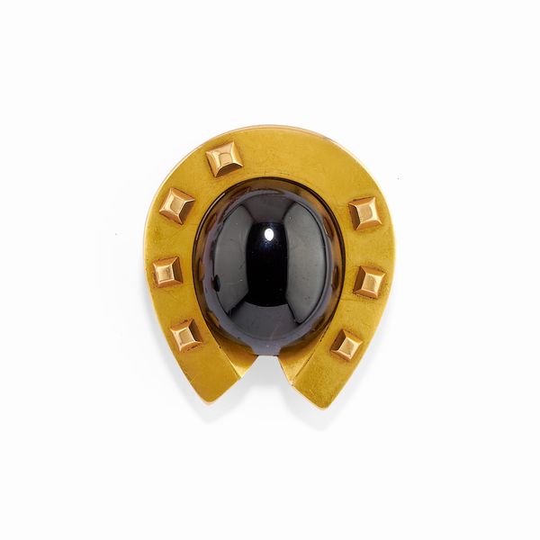 a ferro di cavallo con al centro grande granato taglio ovale cabochon.