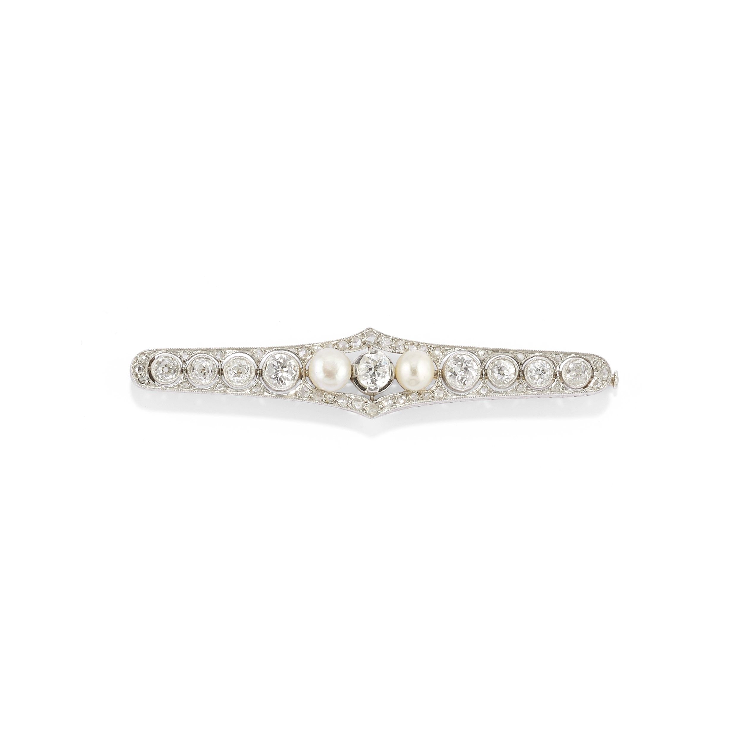 a barretta, con al centro perle (prob. naturali) di mm 6,00 e diamanti taglio vecchio per totale ct 3,00 circa e diamanti taglio rosa a decoro.