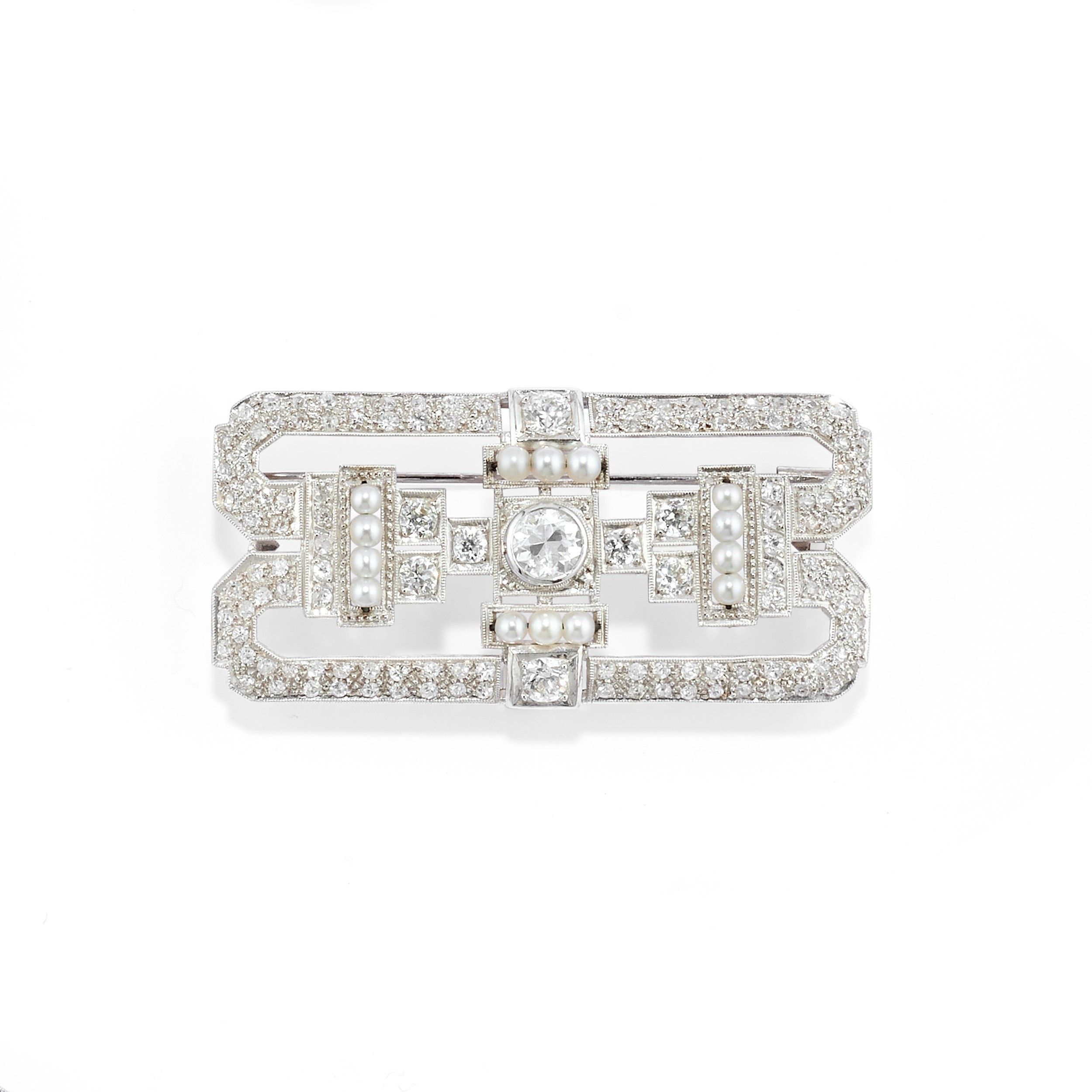 di forma rettangolare, traforata con decoro a milligrano, al centro diamante taglio vecchio di ct 0,60 circa, diamanti taglio vecchio e piccole perle a decoro.