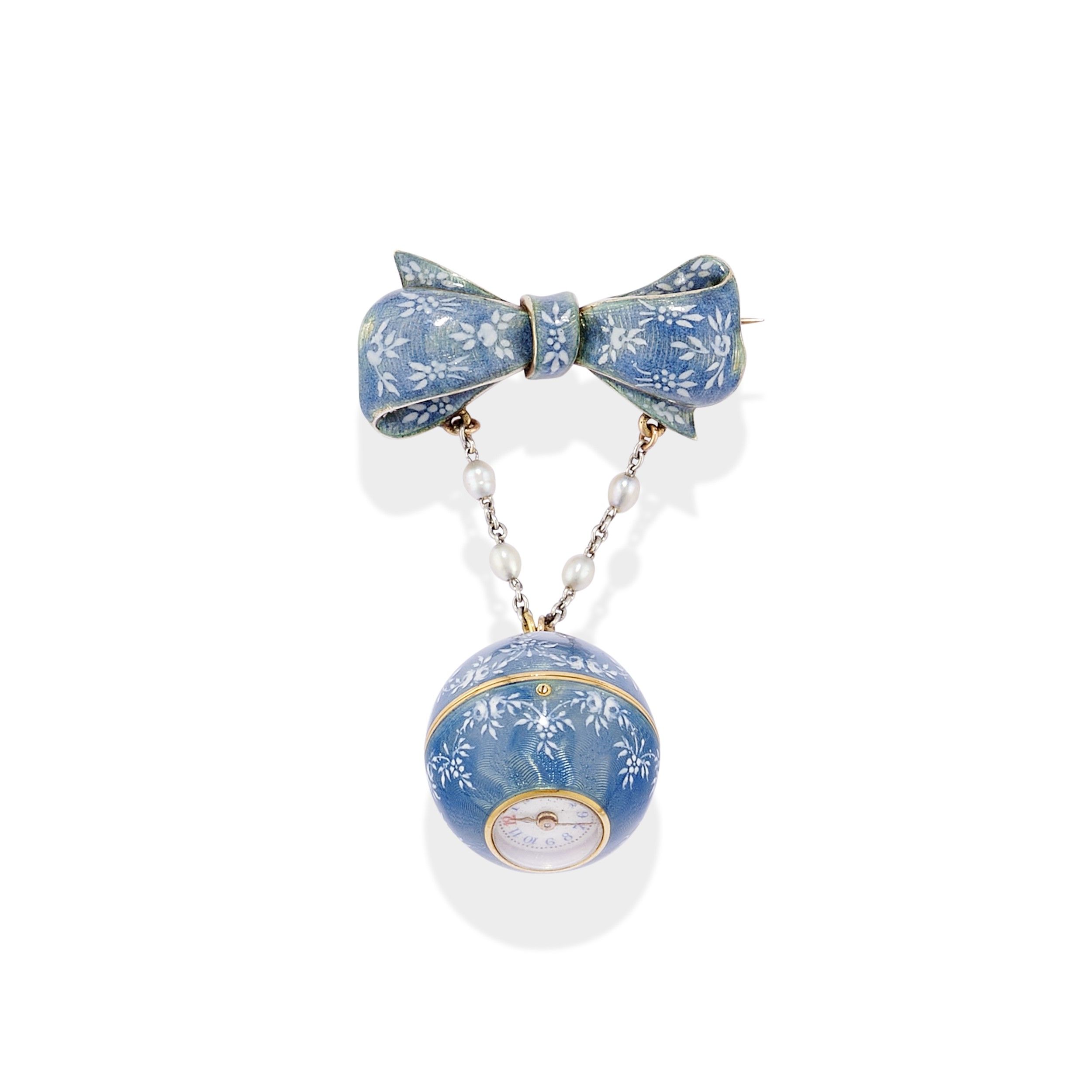 motivo a fiocco trattenente boule con orologio, smalti blu e bianco, difetti (mancanza di smalto), orologio da revisionare.