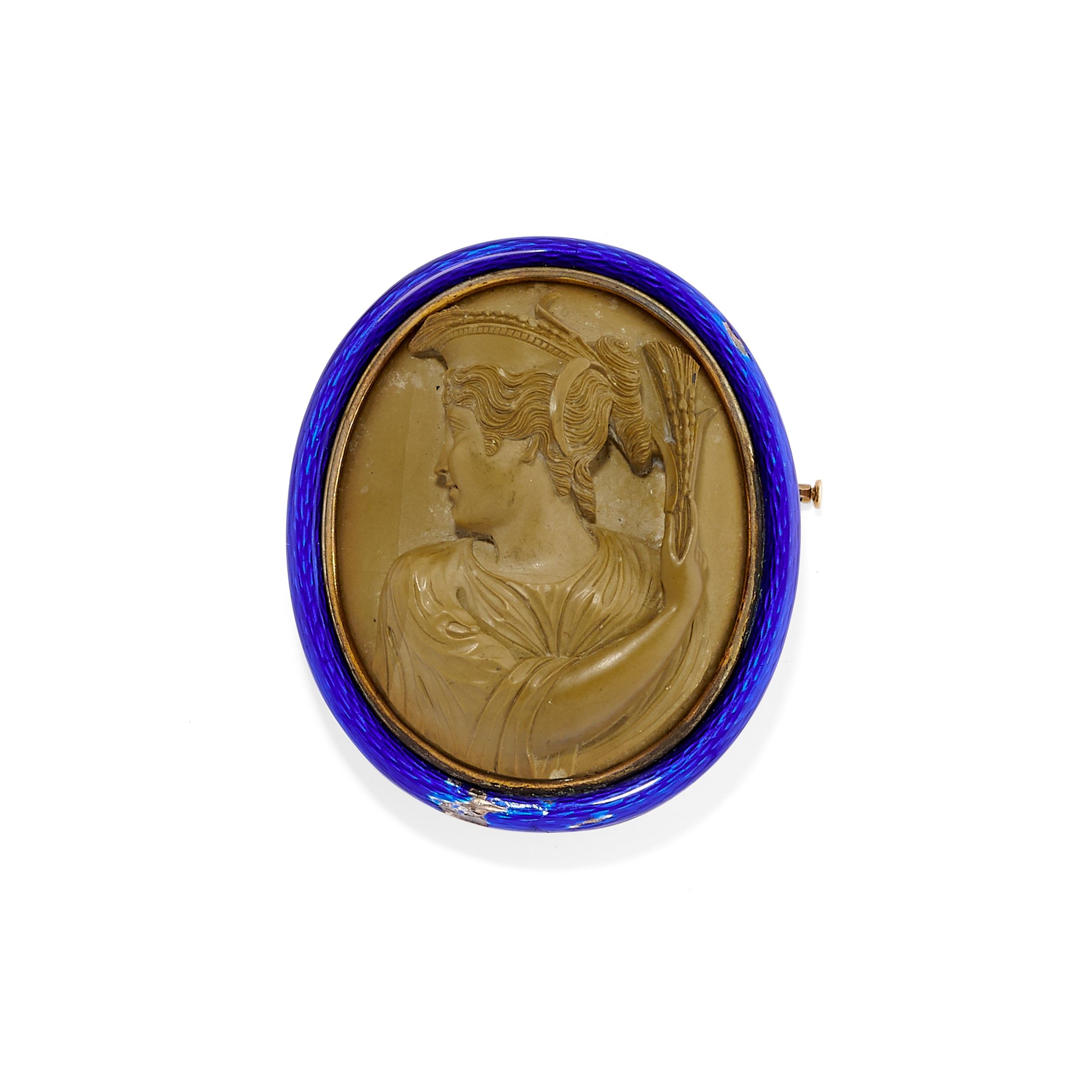 di forma ovale con cammeo in pietra lavica raffigurante profilo femminile, cornice in smalto blu, difetti (visibili mancanze di smalto).