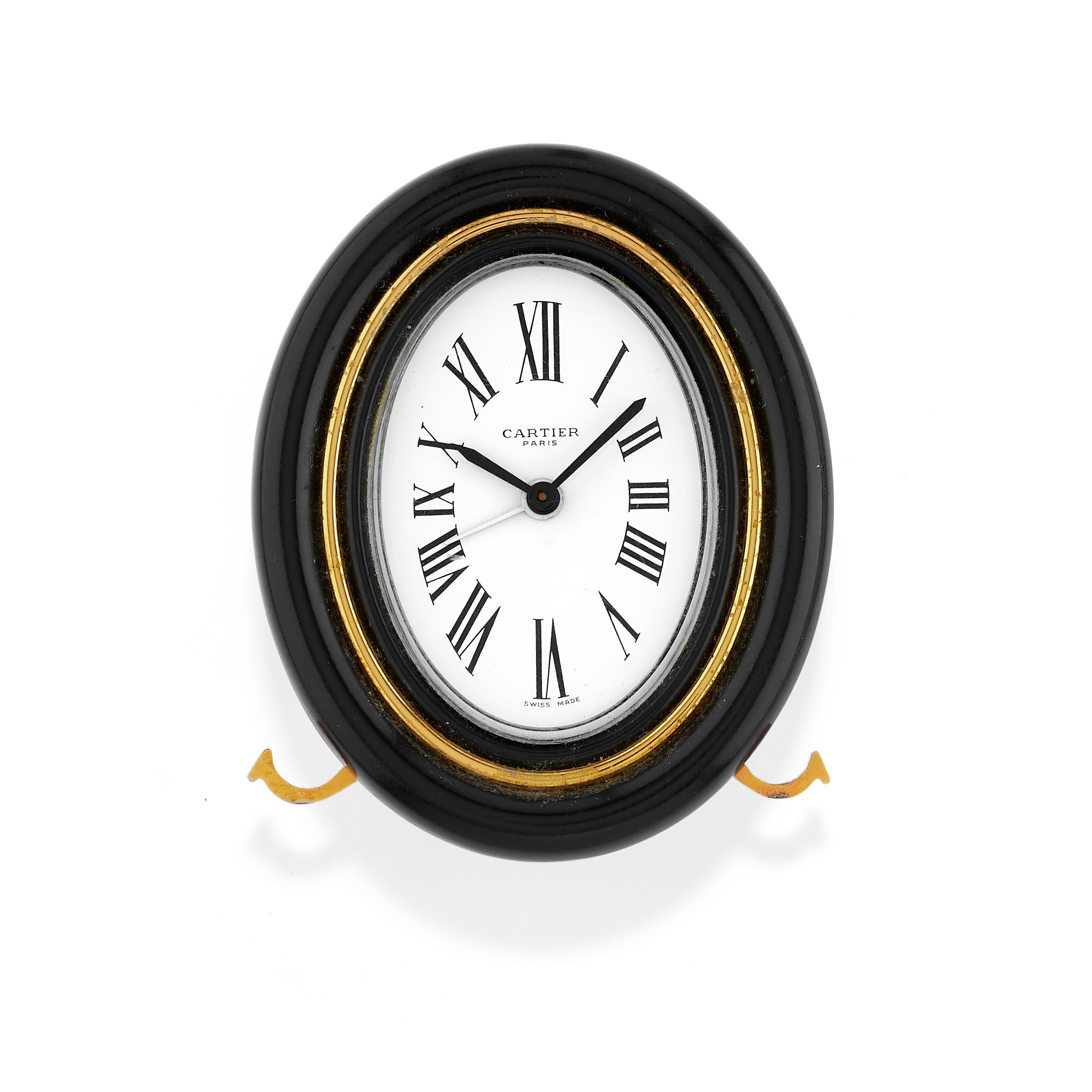 di forma ovale con qu adrante bianco in vetro plastica con numeri romani in smalto nero, movimento a carica manuale, sostegno a due piedi con emblema Cartier, da revisionare.