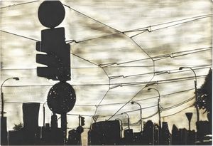 Fustagno decolorato, cm 130,5x190,5 2002 Titolo, data e firma al verso sulla tela: 'Togliere ai fili del tram' [..]