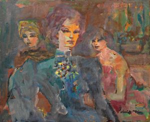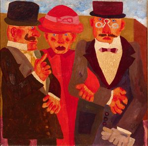 Olio su tela, cm 49,8x49,5 Firma in basso a destra: Borghese; titolo e firma al verso sulla tela: 'Tre personaggi' [..]