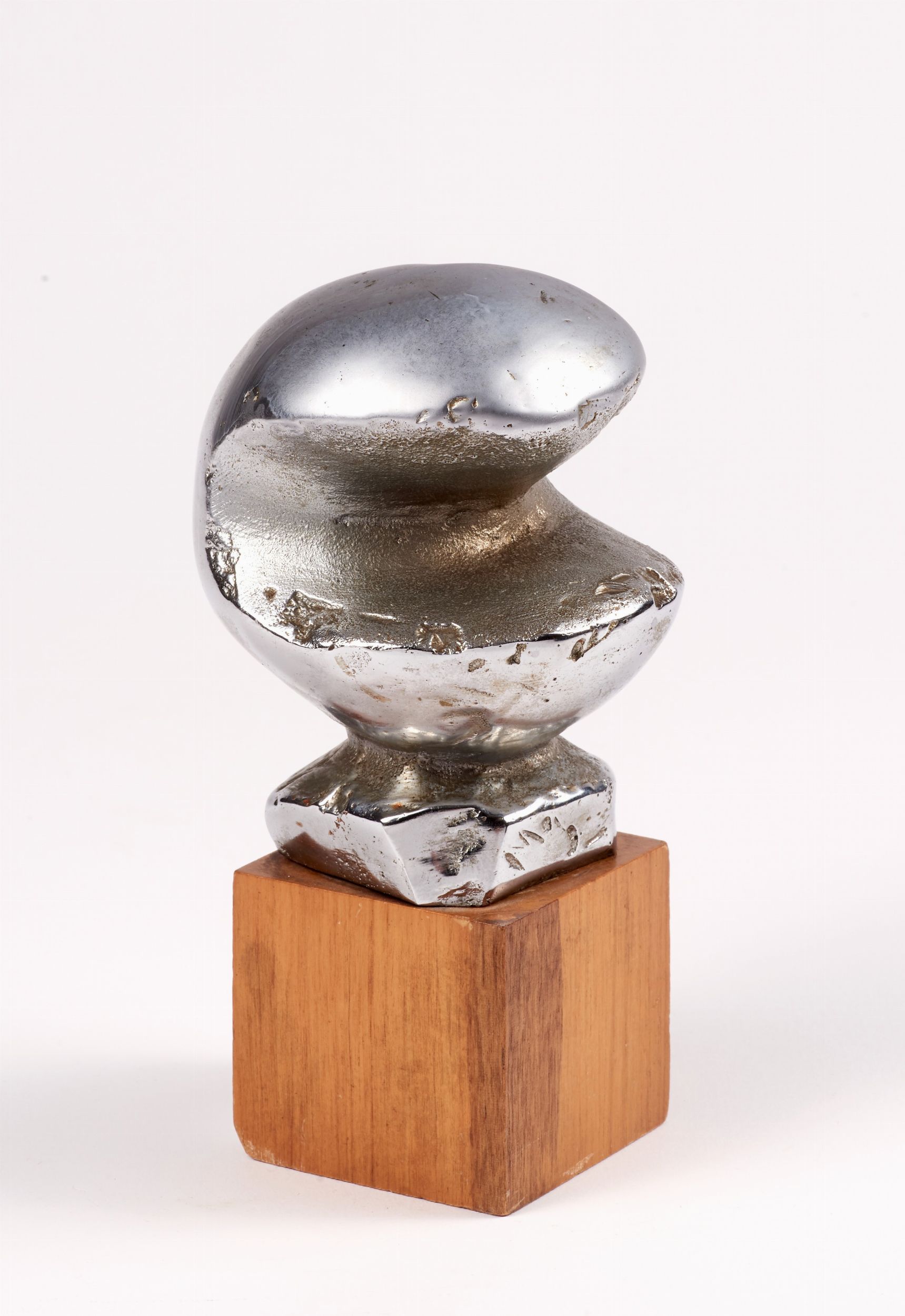 Scultura in metallo cromato su base in legno, multiplo, cm 15,5 h (con base)