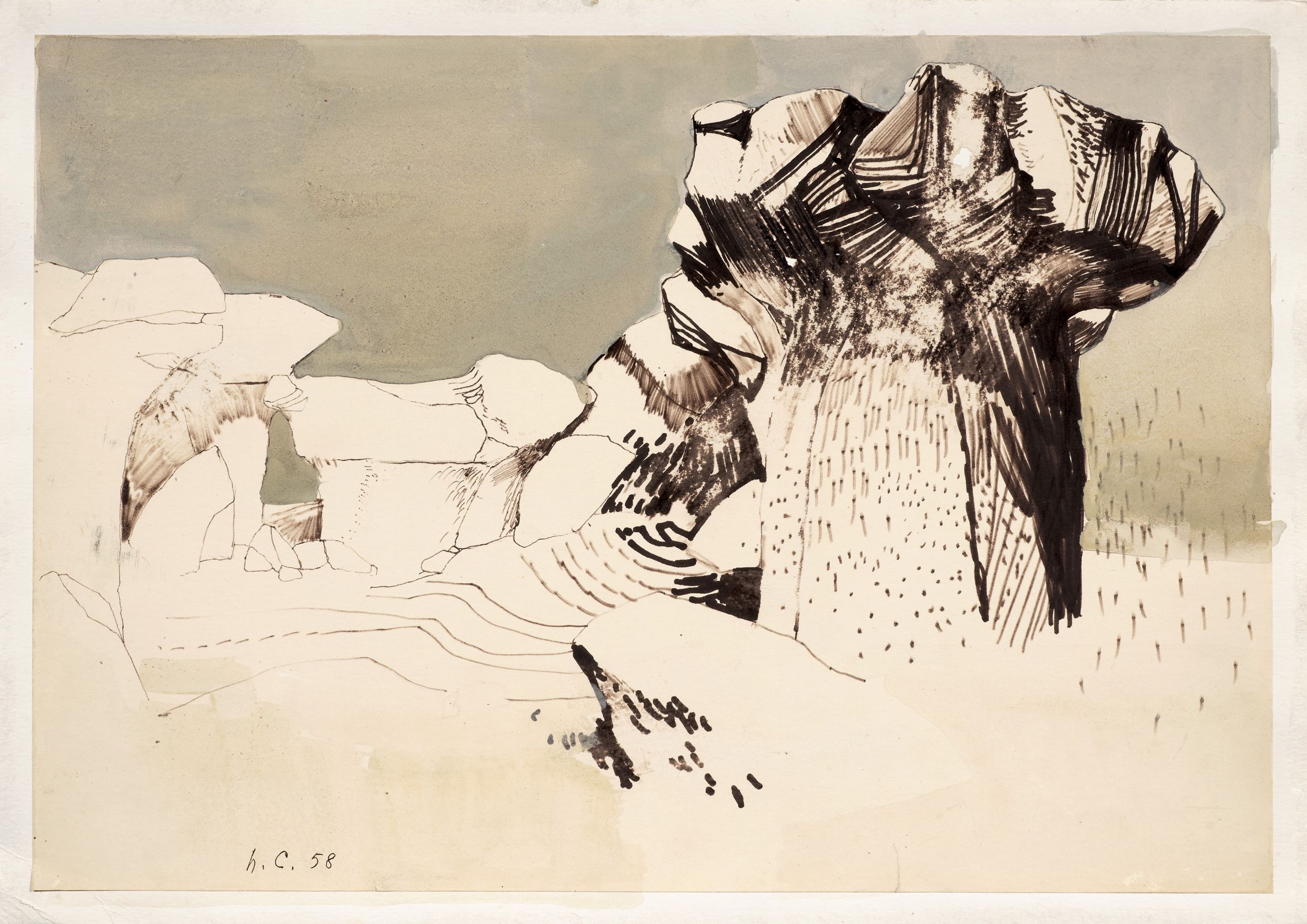 1958 Sigla e data in basso a sinistra: L. C. 58; titolo, firma e data al verso sul cartoncino: 'Le erosioni' / Cremonini 1958.