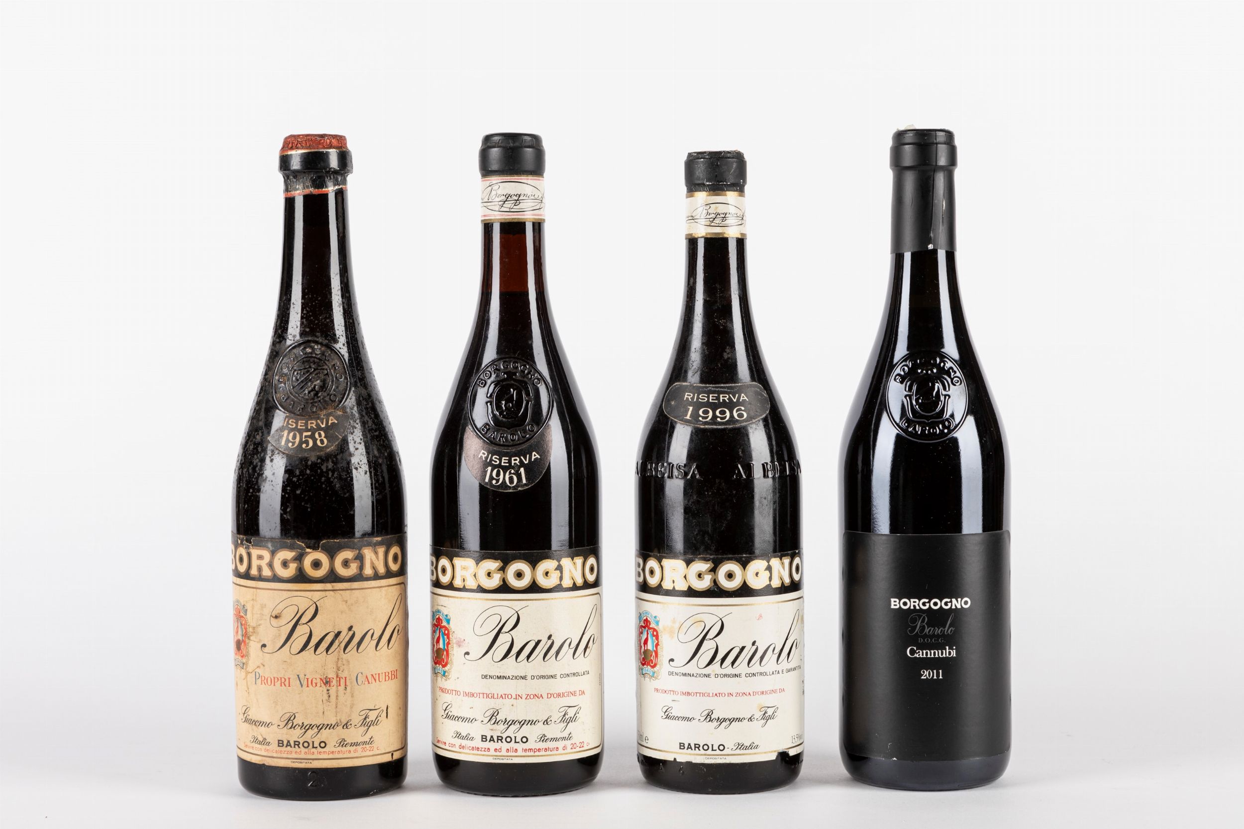 Barolo Borgogno 1958 Riserva Propri Vigneti Cannubi (1 bt), Barolo Borgogno 1996 Riserva (1 bt), Barolo Borgogno 1961 Riserva DOC Giacomo Borgogno e Figli (1 bt), Barolo Borgogno DOCG Cannubi 2011 Giacomo Borgogno e Figli (1 bt)
