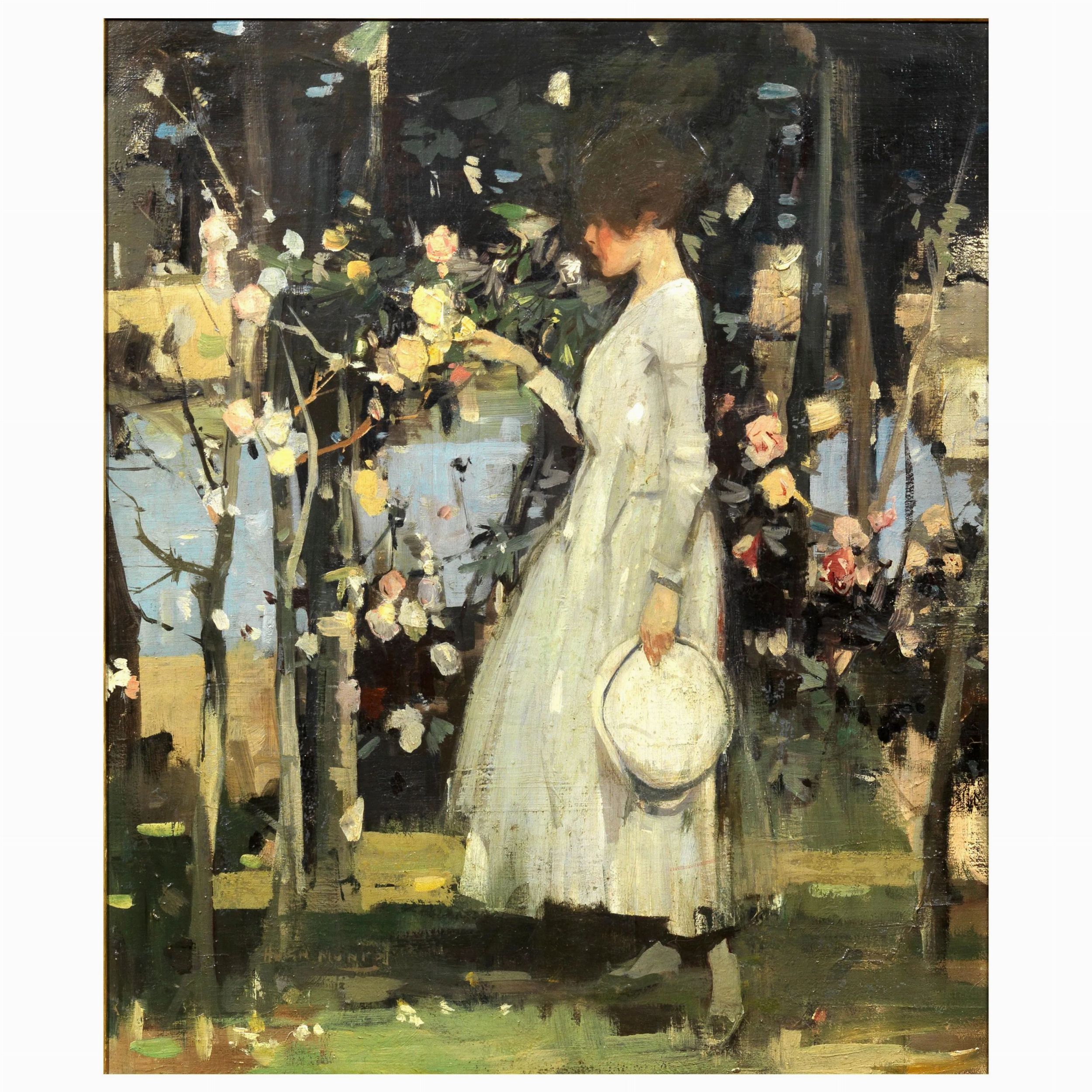 Hugh Munro (Londra, 1856 - Tarascona, 1919) NEL ROSETO olio su tela, cm 51x61 firmato in basso a sinistra al retro: cartiglio Whitford and Hughes Gallery, Londra IN A GALLOWAY ROSE GARDEN oil on canvas, 51x61 cm signed lower left at the back: label Whitford and Hughes Gallery, Londra