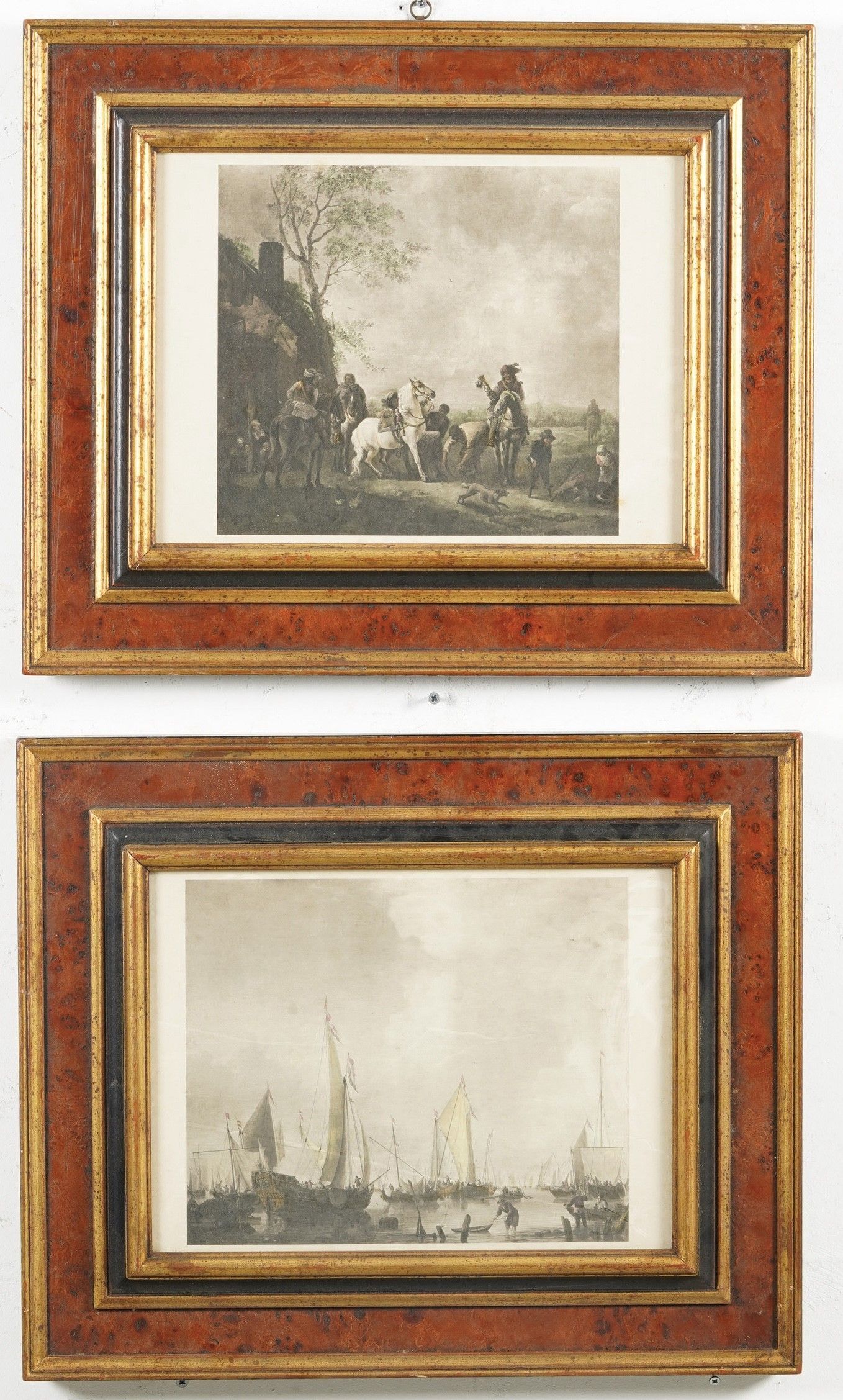 Due stampe raffiguranti velieri e scena con cavalli