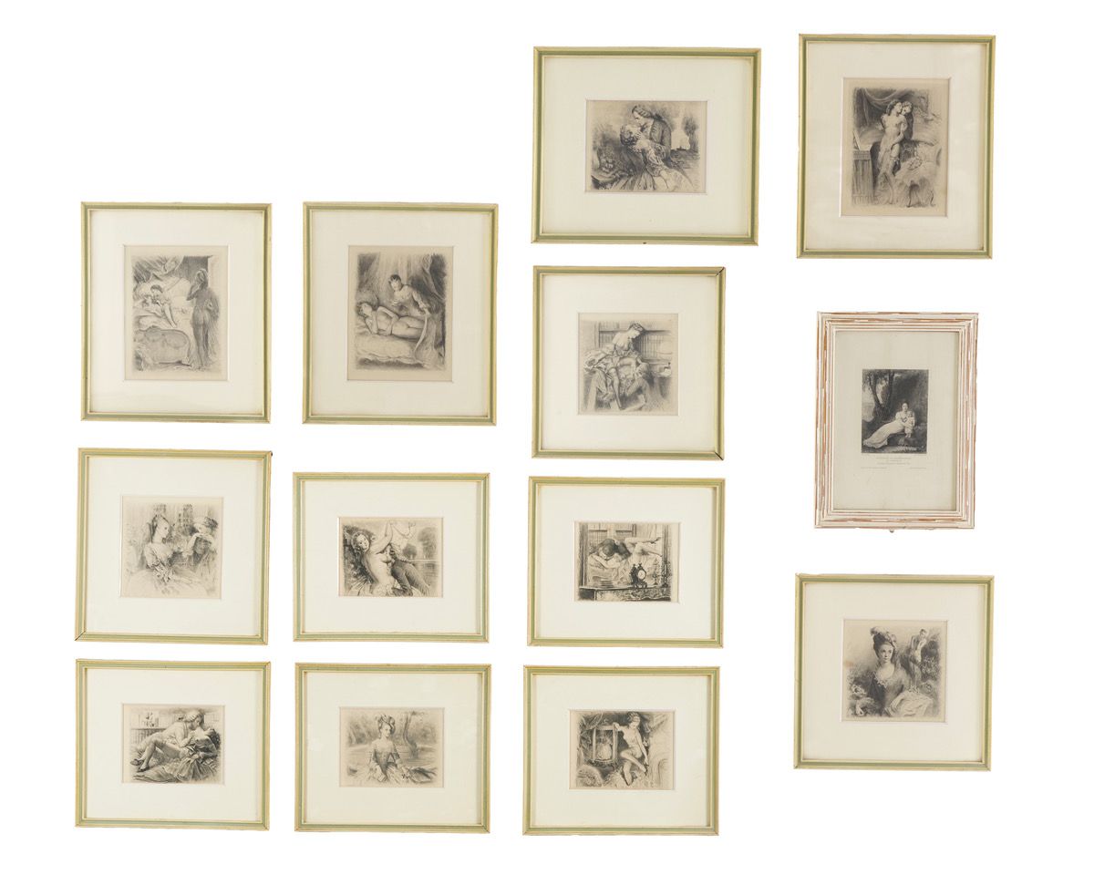 Raccolta di 13 incisioni di soggetto galante ed erotico. Francia, XVIII secolo. Entro cornice