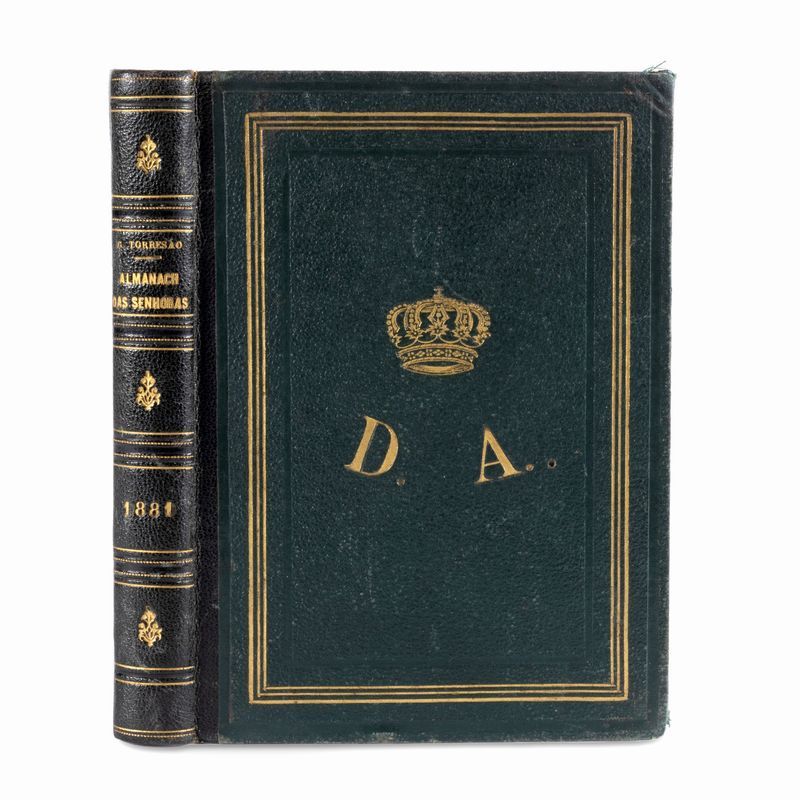 \ 1881 Lisboa, Reddaccao do almanach dos Senhoras. In 8°. Testo inquadrato da filetto, fascicoli di testo stampata su carta gialla, azzurra e verde, 4 fogli piegati, lieve brunitura, legatura in percallina verde, 2 cornici ai piatti, al centro del campo il monogramma coronato 'D A'.