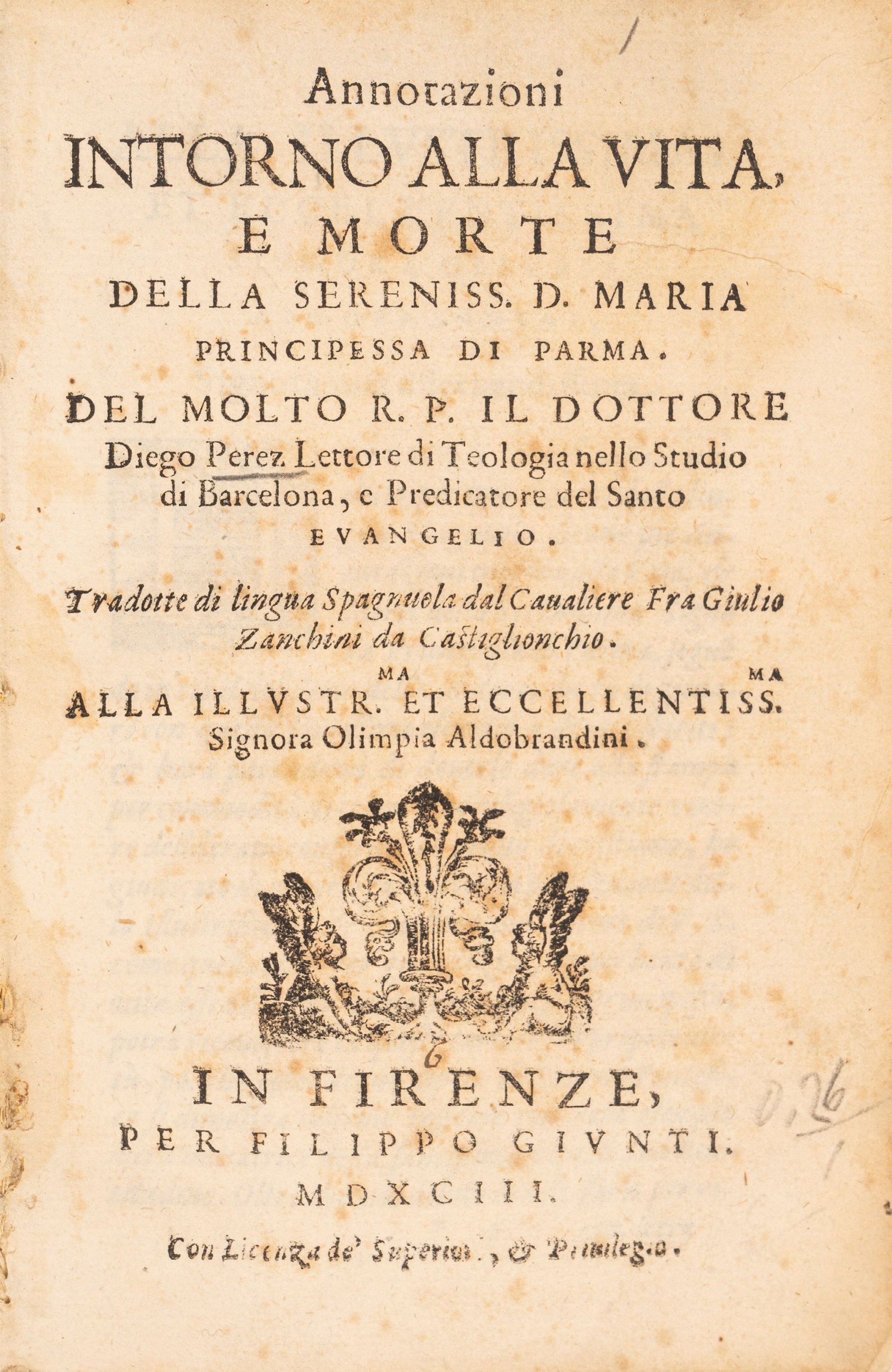 1593 Firenze, appresso i Giunti, 1593, in 8°. Legatura in pergamena floscia e il titolo è scritto in inchiostro bruno sul dorso. Marca tipografica al frontespizio e al colophon, capilettera e finalini xilografici. Bruniture e macchie. Restauro pergamenaceo al dorso e danni alla legatura del libro. N2 erroneamente segnata O2.