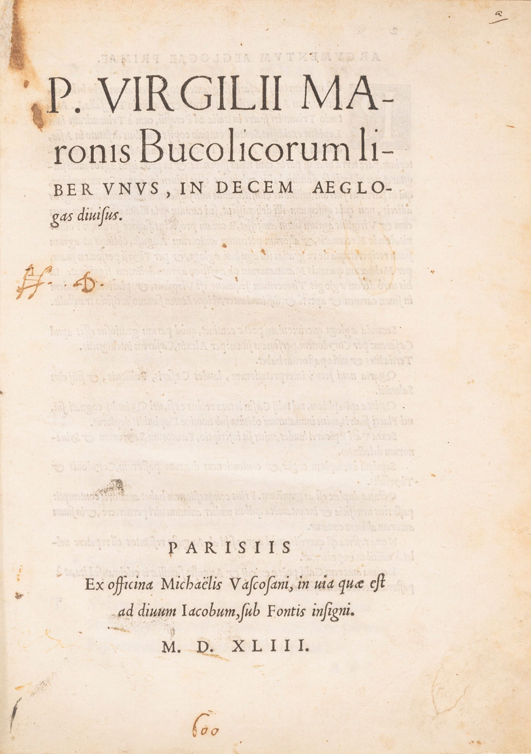 1543 Parigi, Ex Officina Michel Vascosan, 1543, in 4°. Comprende anche Georgicon e Aeneidos dello stesso autore, ma con segnature e frontespizi propri. Legatura in cartonato con dorso in pergamena. Due tasselli bruni con titolo, autore, editore e anno impressi. Capolettera xilografici. Macchie e leggere bruniture.