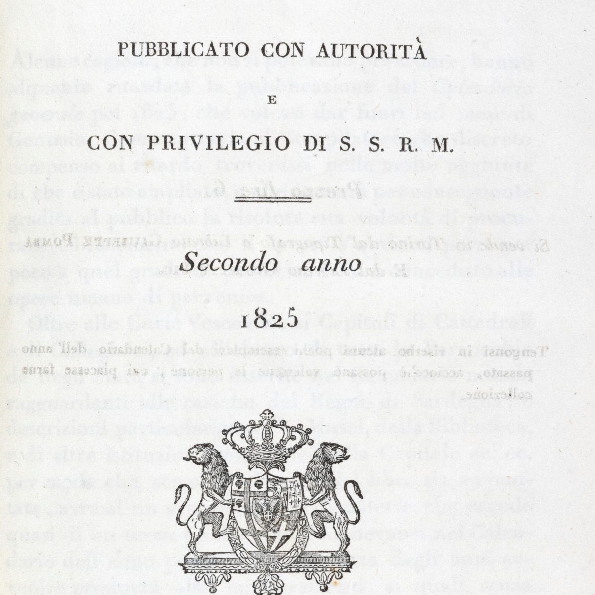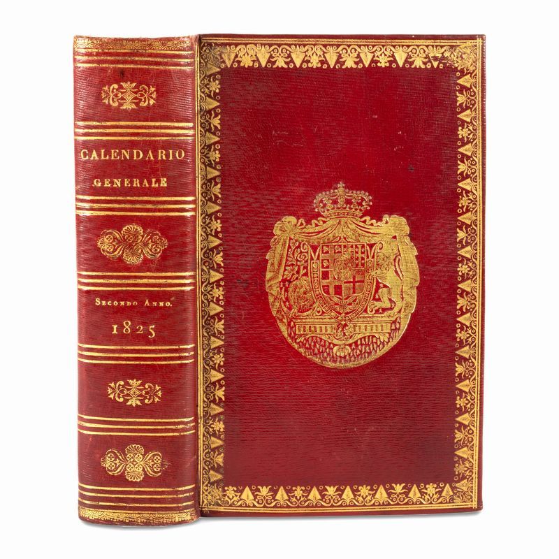 1825 Torino, Pomba, 1825. In 8°. stemma calcografico, legatura in marocchino rosso a grana lunga, cornice a inquadrare i piatti, al centro del piatto anteriore grande stemma del Regno di Sardegna, all'inferiore stemma diverso, dorso liscio, titolo, data e fregi in oro, tagli dorati,