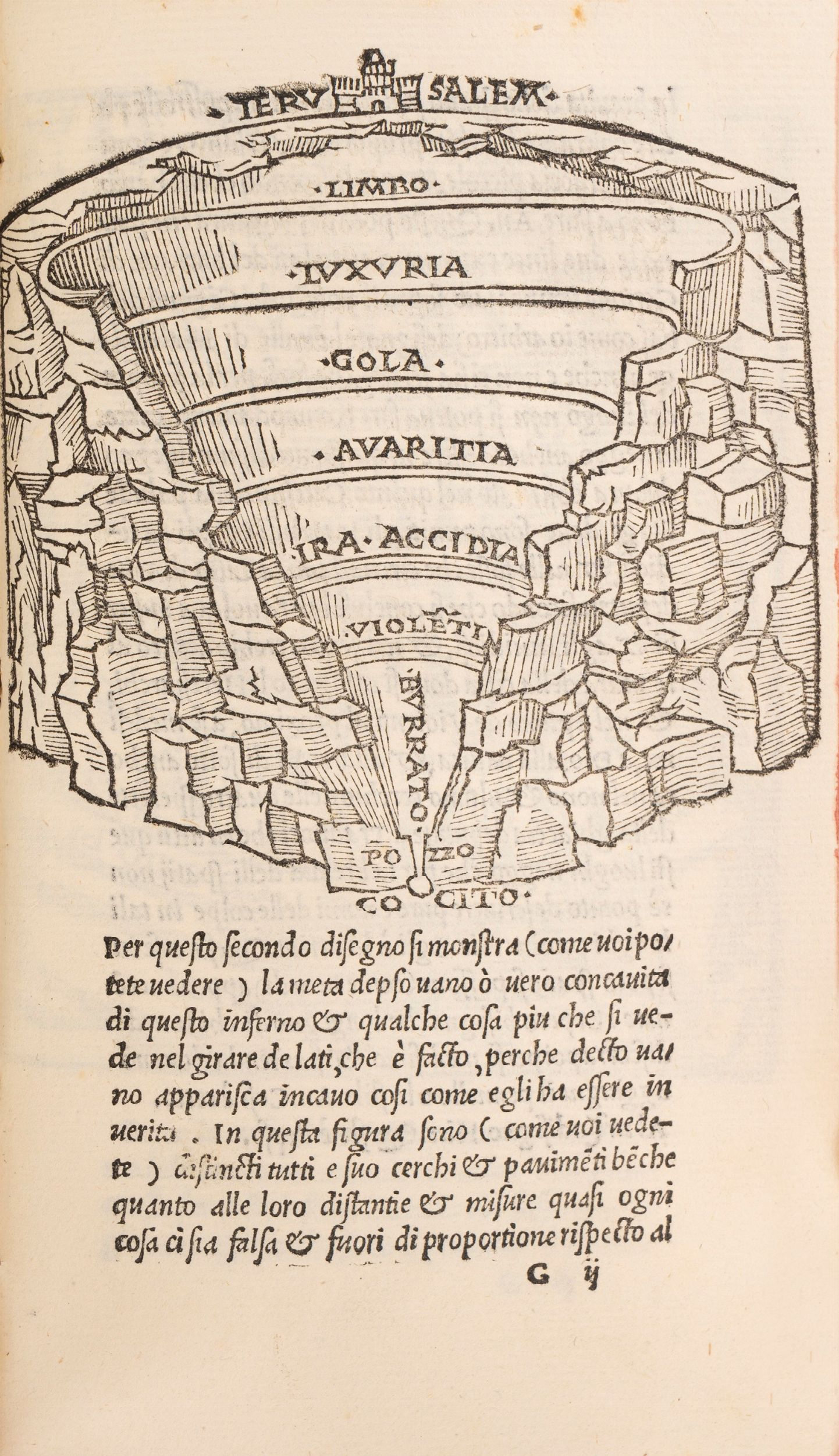1506 Firenze, per opera & spesa di Philippo di Giunta fiorentino, 1506 a di XX d'agosto. In 8°. 157 x 95 mm. Illustrazione xilografica a piena pagina raffigurante Dante nel vestibolo infernale con le tre fiere e 7 incisioni xilografiche a quasi piena pagina raffiguranti piante e spaccati dell'inferno dantesco, marginali arrossature e lievi aloni, postille di mano coeva soprattutto nel Purgatorio e Paradiso, SPLENDIDA LEGATURA VENEZIANA COEVA ALLA FORTUNA , dorso restaurato e in parte rifatto, tagli rossi. Il presente esemplare contiene, dopo il testo della Commedia, il Dialogo di Manetti nella seconda versione a noi nota. Edizione stampata probabilmente a Firenze da Filippo Giunta il vecchio (per il tipografo e la data confronta D. Decia, I Giunti tipografi editori di Firenze 1497-1570 , vol. I, p. 246, n. 2). Manca dunque il colophon dell'edizione del 1506 e le carte finali di errata.