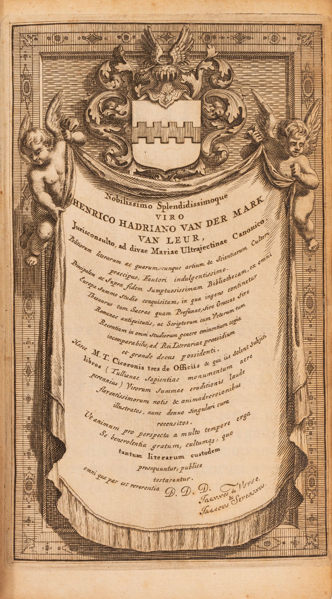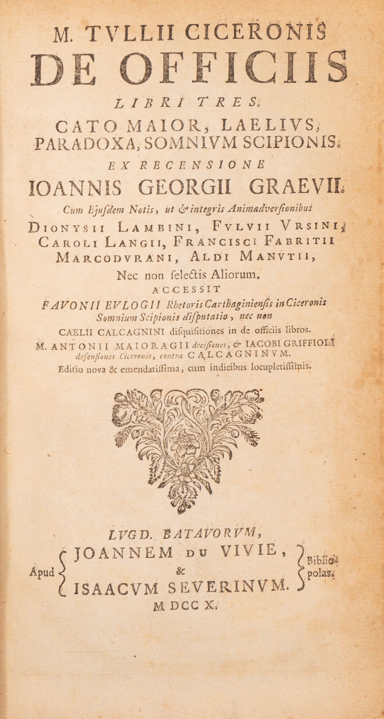 1710 In antiporta ritratto di Cicerone a piena pagina. Al frontespizio grazioso fregio. Leida, Joannem Du Vivie e Issacum Severinum, 1710. In 4°.