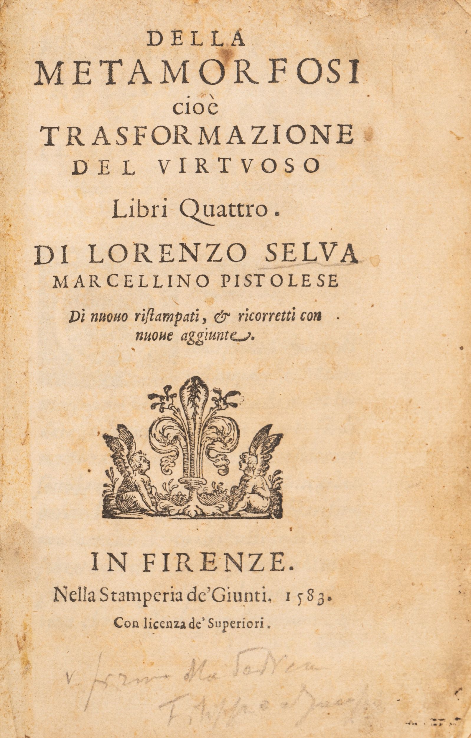 1583 Firenze, appresso i Giunti, 1583, in 8°. Legatura in cartonato con restauri. Titolo scritto in inchiostro bruno al dorso. Testatine, fregi e capolettera xilografici e marca tipografica al frontespizio e al fine. Danni alla legatura, macchie e bruniture. G2 č stato erroneamente segnato G8.
