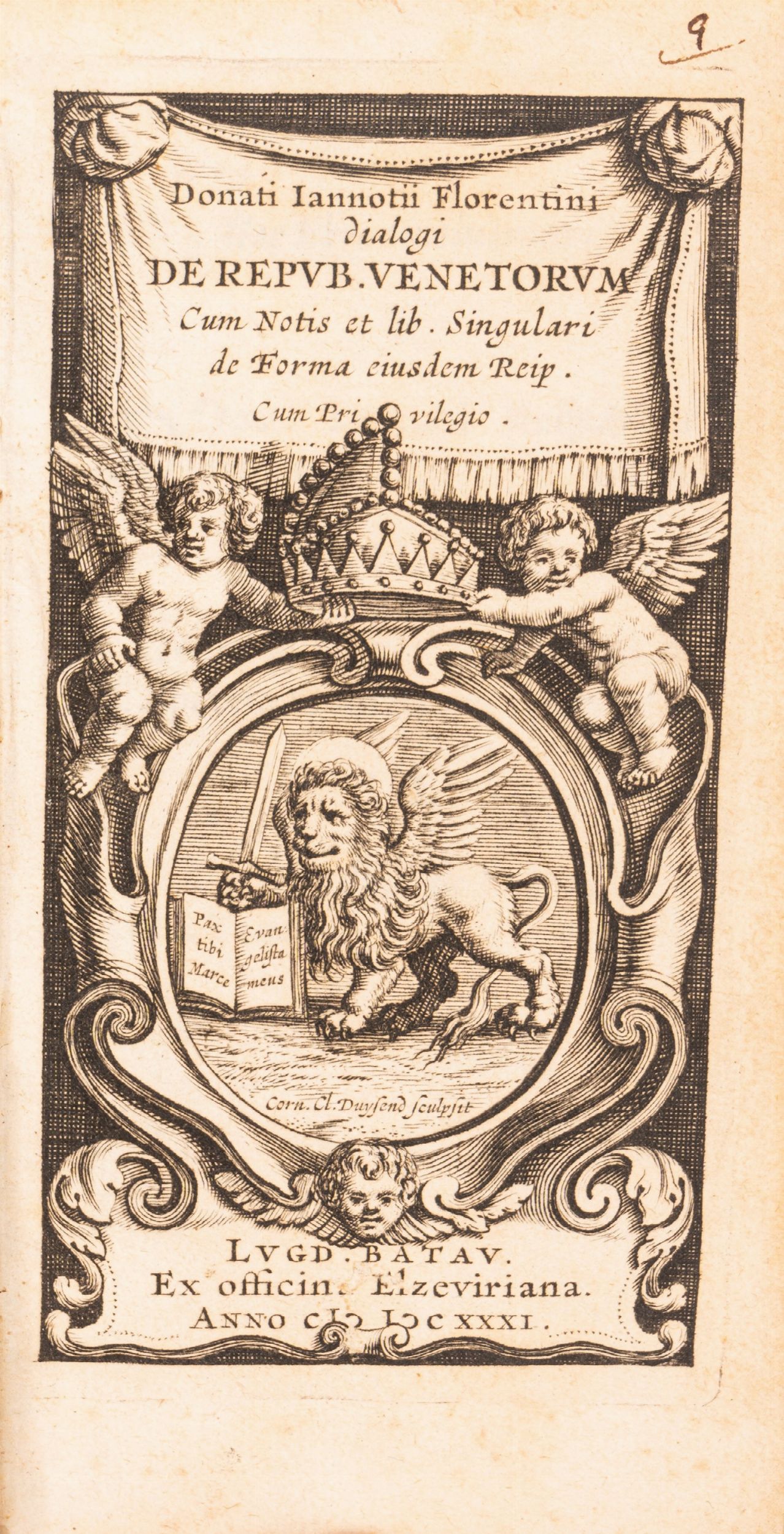 1631 Leida, ex Officina Elzeviriana, 1631, in 24°. Contiene anche In Donatum Iannotium et Casparem Contarenum cardinalem, de republica Veneta con frontespizio proprio a R6 datato al 1642. Legatura in pergamena piena e frontespizio inciso con simbolo di Venezia da Cornelis Claesz Duysend. Il volume è corredato da 5 tavole doppie e ripiegate. Testatine e capilettera xilografici. Bruniture, strappi marginali e macchie. Y5 è stato erroneamente segnato come Z5 e Z5 come Aa5.