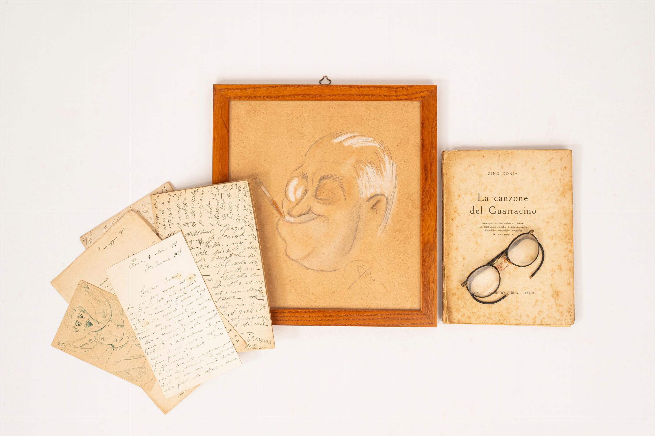 1900 Vasto e significativo insieme di cimeli e documenti di casa Doria, eterogeneo e multiforme: un crocifisso in osso, una busta di occhiali (i tipici indossati da Doria), tre divertenti caricature in quadretti, vari volumi: Alcune schede di erudizione galante , Napoli, 1959; Elucubrazioni galanti, Edizioni del Delfino, 1977, le bozze di stampa utilizzate per una successiva edizione; altri estratti; La Canzone del Guarracino, Napoli, 1933; un prezioso diarietto in elegante zigrino verde con 33 battute e aforismi di pugno di Doria sul Fascismo; saggio di Doria, Vincenzo Moreno , Napoli, 1907; Una lettera inedita di Vincenzo Monti a Luigi Serio , Napoli, 1909, con dedica; decine di belle e lunghe lettere da Orsolina Tramontano; una cartolina disegnata; un corposo insieme di lettere di Doria a parenti e un altrettanto ricco carteggio di amici e parenti a Doria, per oltre 200 missive.