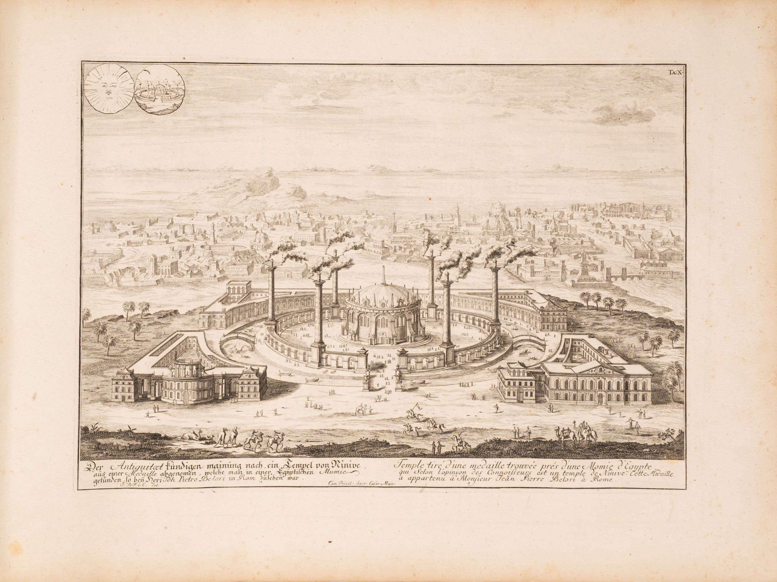 1725 Lipsia, 1725. In folio oblungo. 5 parti in un volume. Con 86 tavole incise, ciascuna con didascalia in tedesco e in francese, arrossature sparse, brunitura su alcune carte. Legatura in mezza pelle con angoli, titolo e fregi impressi in oro al dorso, qualche spellatura.