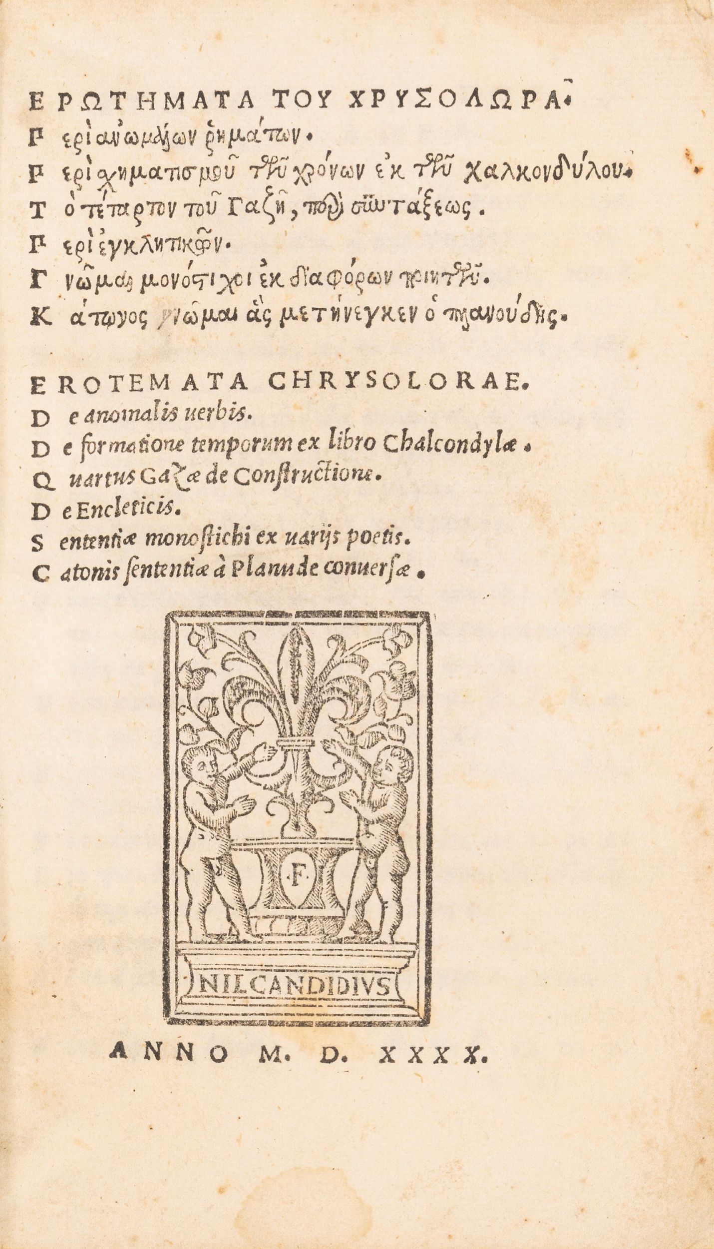 1540 Firenze, appresso Benedetto Giunti, 1540, in 8°. Legatura in cartonato e angoli e dorso in pergamena. Due tasselli arancioni con titolo, tipografo e anno. Marca tipografica al frontespizio e al fine. Testo in greco. Leggere bruniture.