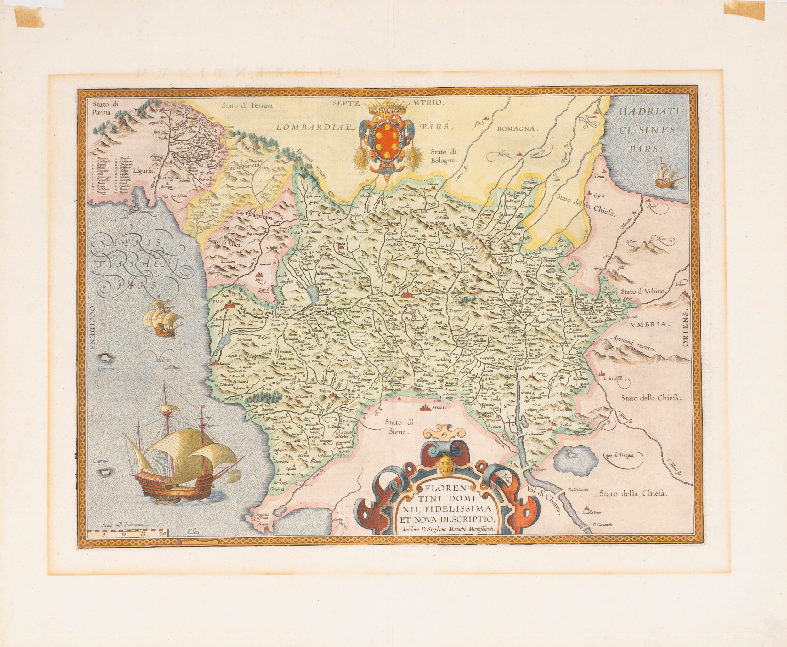 1595 Incisione su rame, colorata, cm 49x58. Testo latino al verso. Derivazione della rarissima carta di Stefano Buonsignori inserita nel Theatrum Orbis Terrarum di Ortelius a partire dal 1595. Con passepartout.