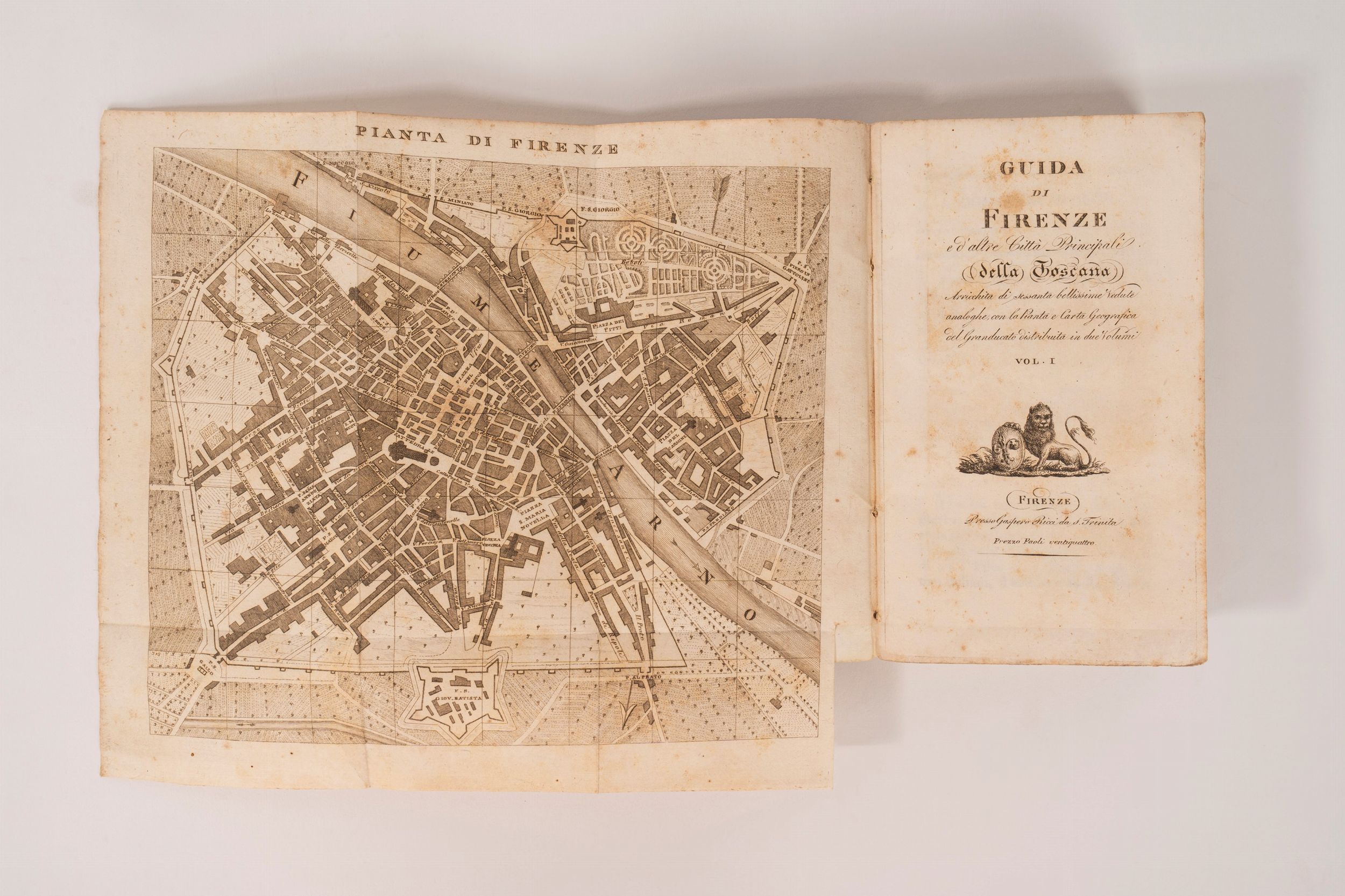 1820 Firenze, presso Gaspero Ricci da S. Trinità. Libro in due volumi. 58 tavole singole con le vedute delle città toscane e 2 tavole ripiegate raffiguranti la pianta della città di Firenze e della regione Toscana. Strappi marginali, bruniture, lievi danni alla legatura del libro, segni del tempo.