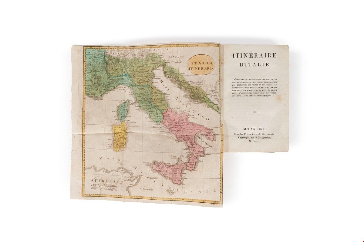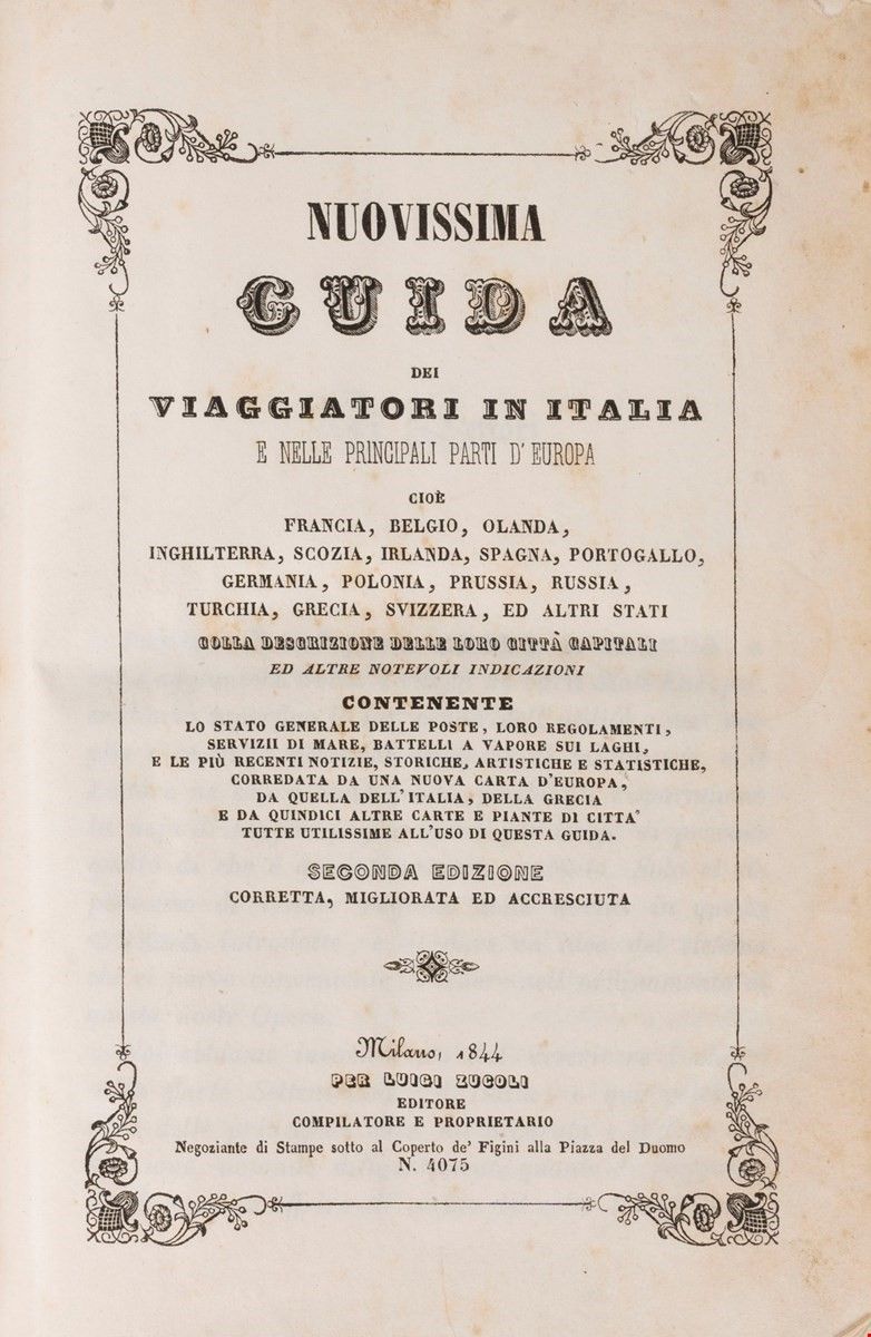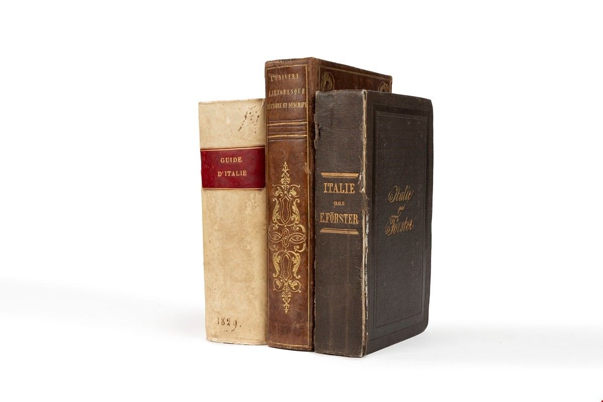 Lotto contenente 80 guide a stampa e pubblicazioni dedicate ai viaggi ed agli itinerari in Italia , perlopiù in italiano, la maggior parte corredate da carte itinerarie, più una preziosa guida manoscritta di Antonio Giachi arricchita da 14 viaggi splendidamente acquerellati e un diario di viaggio manoscritto del nipote di Lord Byron . Gli autori sono quelli noti per il genere: Giuseppe Nave, Domenico Boccolari, Franz Schott, Girolamo Franzini, Biondo Flavio, Giovanni Maria Vidari, Giuseppe Tofani, Francesco Tiroli, Marius Bernard, Pasquale Agnelli, Carlo Barbieri, MIchelangelo Prunetti, FRncesco Tiroli, Lorenzo Baroni etc.