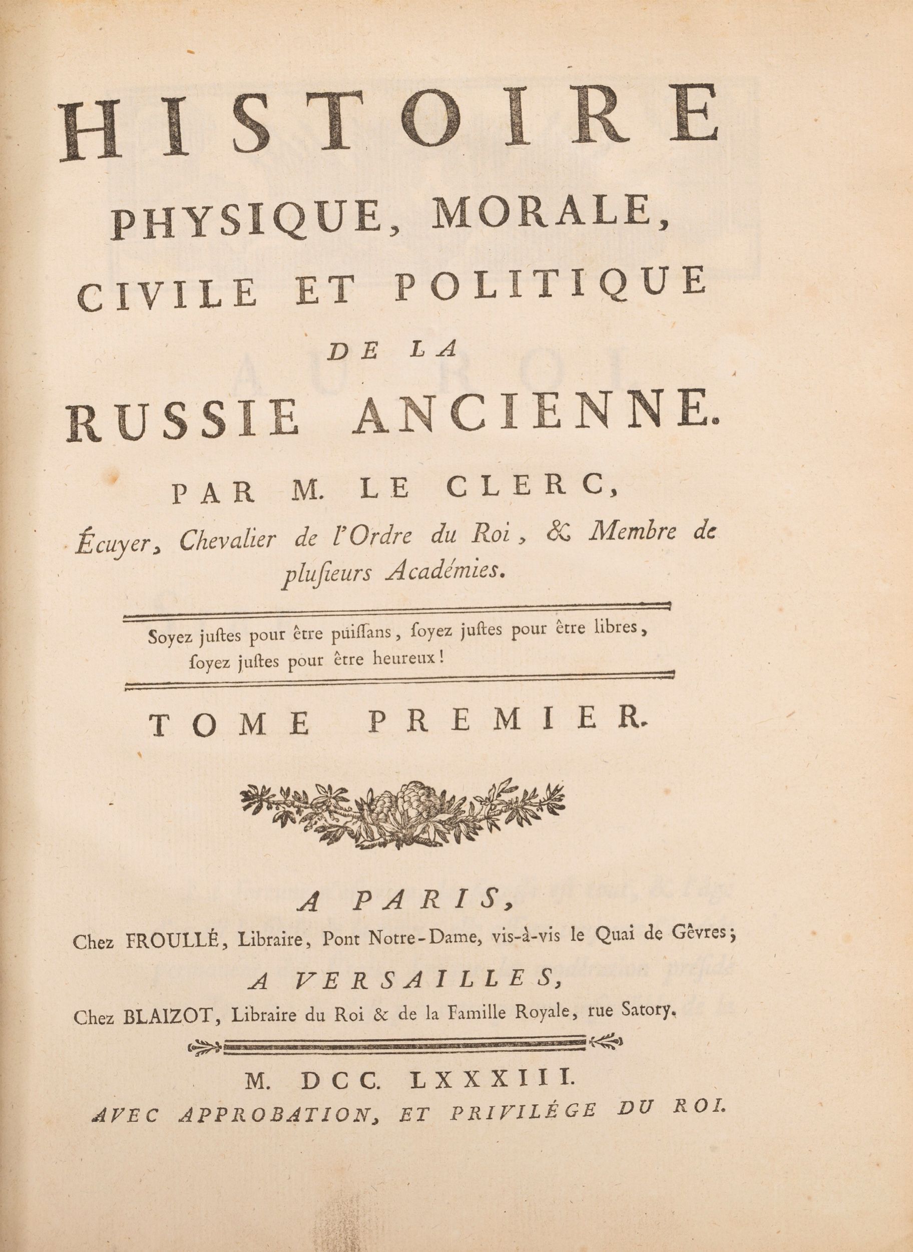 1783 Parigi: Froullé e Versailles: Blaizot, 1783-1794. 6 volumi in 4° e un atlante in 2°. Numerose tavole incise, carte geografiche e tavole statistiche a piena pagina e ripiegate, leggera brunitura, leggermente più intensa su poche carte. Legatura coeva in vitello screziato per i 6 volumi di testo, legatura in mezza pelle per l'atlante, titolo e numero di tomo entro tasselli al dorso con fregi impressi in oro, ai piatti stemma della 'Society of Writers to His Majesty's Signet' , tagli colorati, qualche difetto ai dorsi e agli angoli, in particolare all'atlante.