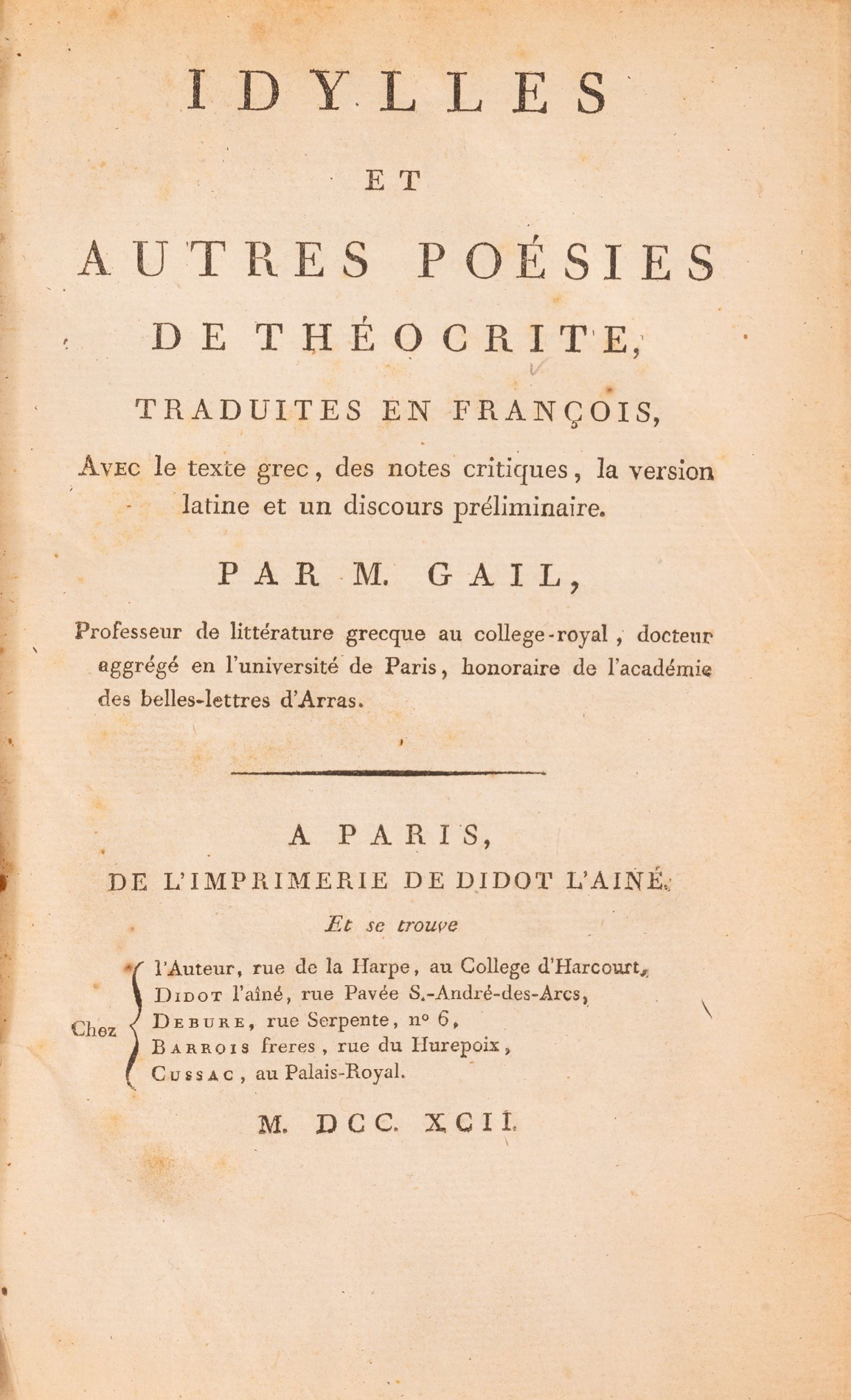 1792 Parigi, Didot L'Aine, 1792. In 8° grande. Idilli e altre poesie di Teocrito stampate in greco con traduzione accanto in francese. Al contropiatto anteriore ex libris Holland House ed ex legato 'Soronis Napoleonis Paullinae Burghesiae'. Foglio di guardia colorato in rosso e nero. Legatura in vitello marmorizzato con piatti inquadrati da cornice impressa in oro. Dorso in vitello marrone con titolo su tassello più scuro. Difetti al dorso.