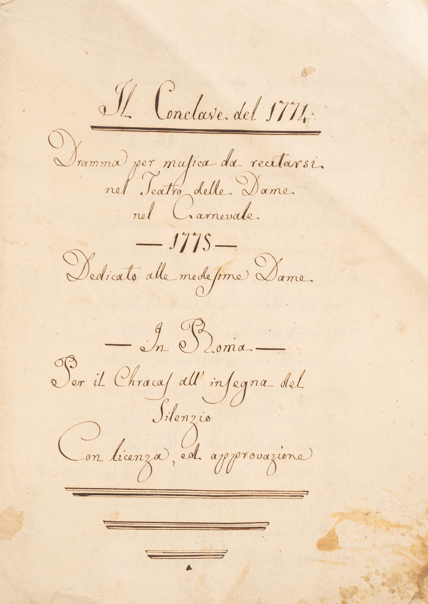 1775 Manoscritto. Dramma per musica da recitarsi nel Teatro delle Dame nel Carnevale. All’Argomento seguono i nomi dei ballerini e degli interlocutori.