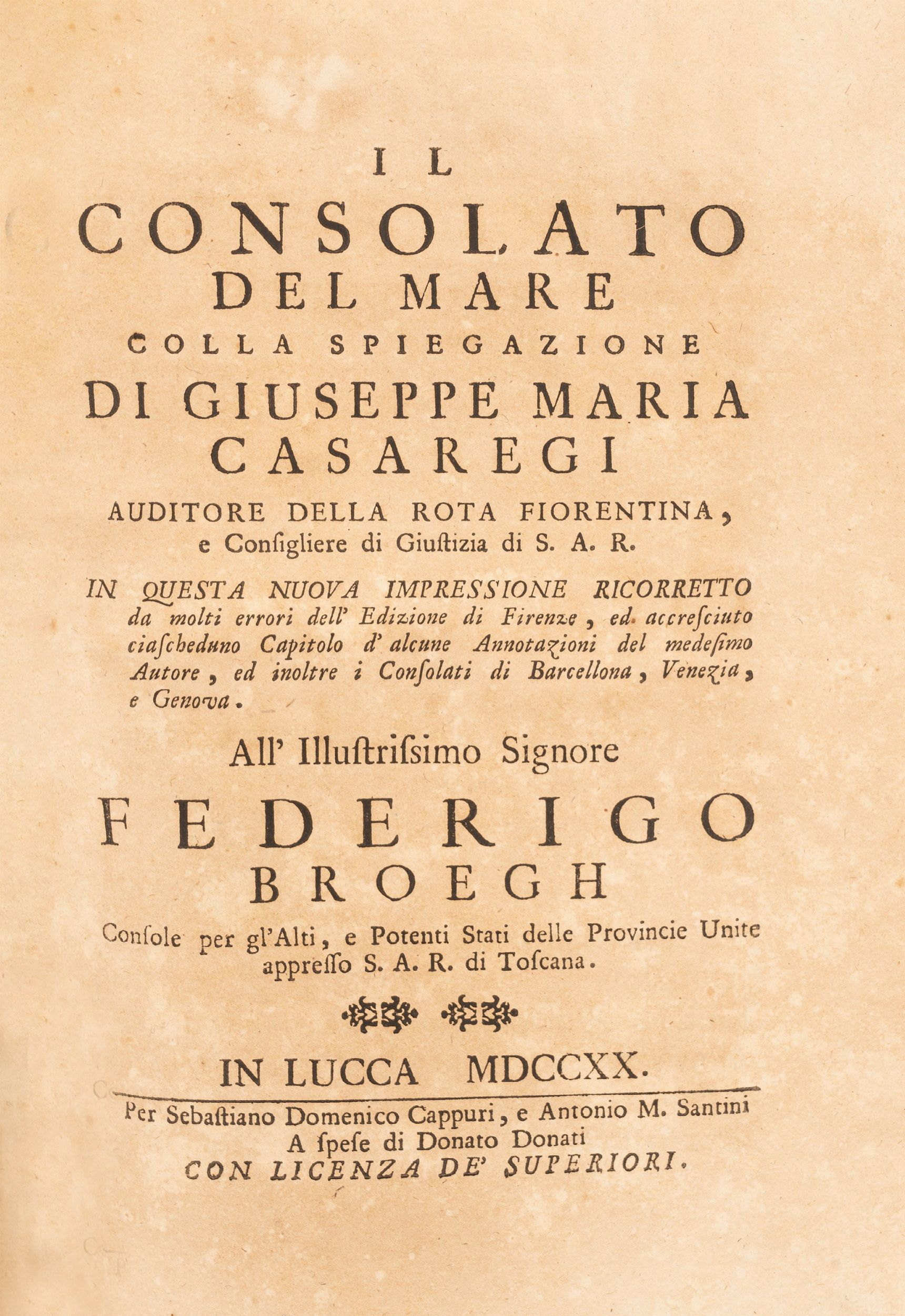 1720 Lucca, Sebastiano Domenico Cappuri e Antonio M. Santini, 1720. In 4°. Dedica a Federico Broegh, iniziali ornate e fregi, occhietto parzialmente staccato, brunitura uniforme più intensa alle prime e alle ultime carte. Legatura in mezza pergamena coeva, titolo manoscritto al dorso. Esemplare in barbe.
