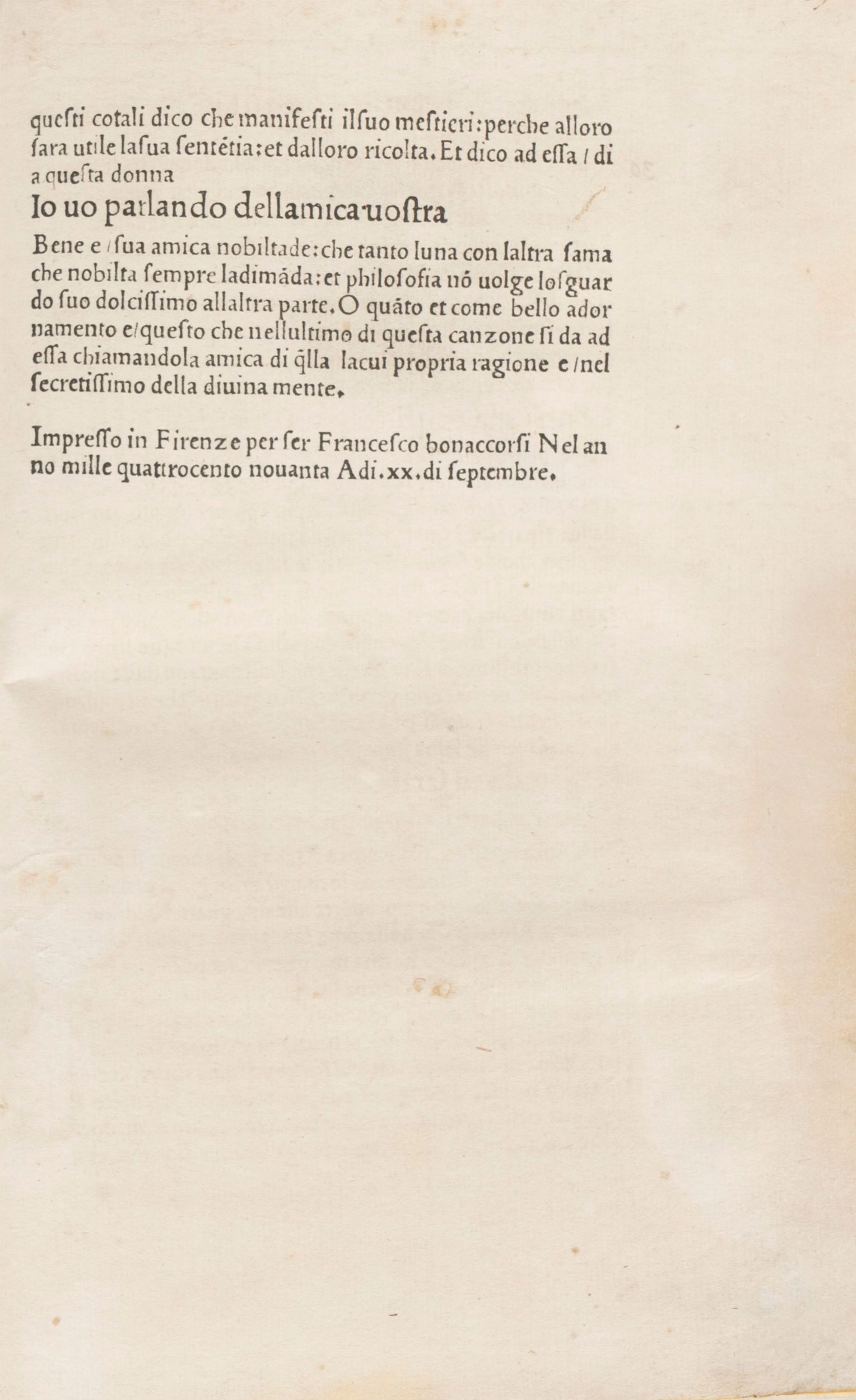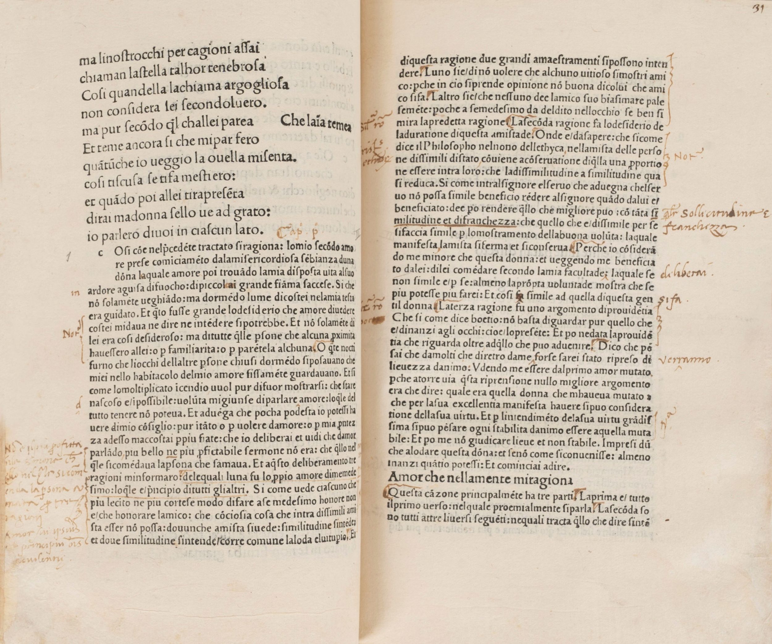 1490 Firenze, Francesco Bonaccorsi, 20 settembre 1490. In 4°. 90 carte, a–k8l¹°. Caratteri 110R e 78R. Splendido esemplare fittamente postillato da almeno due mani diverse, tutte cinquecentesche, legatura in pelle verde del sec.XIX con impressioni a secco, tagli dorati. Targhetta della libreria Il Polifilo di Milano.