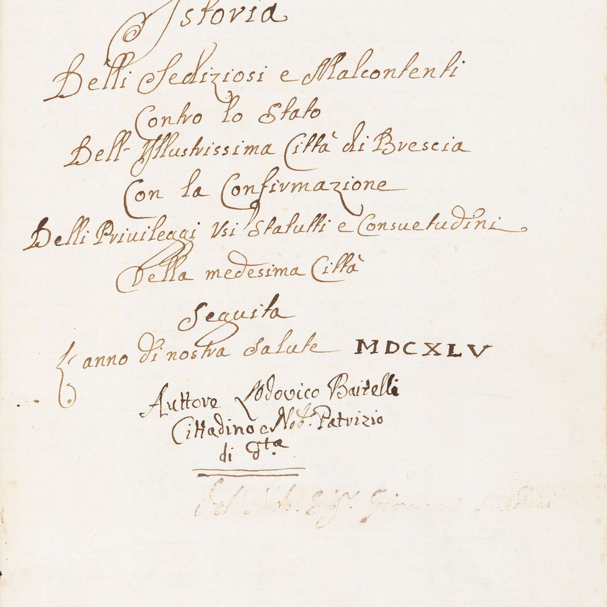1645 Manoscritto cartaceo datato 1645, 285 x 205 mm., di 168 cc. numerate (non la I che reca il frontespizio calligrafico), vergate in elegante cancelleresca da un'unica mano, occasionali lettere iniziali calligrafiche, legatura in cartone alla rustica. Ex libris al contropiatto del Conte A. Suardo.