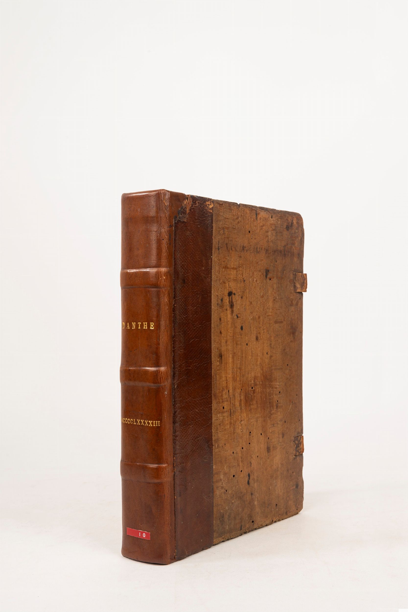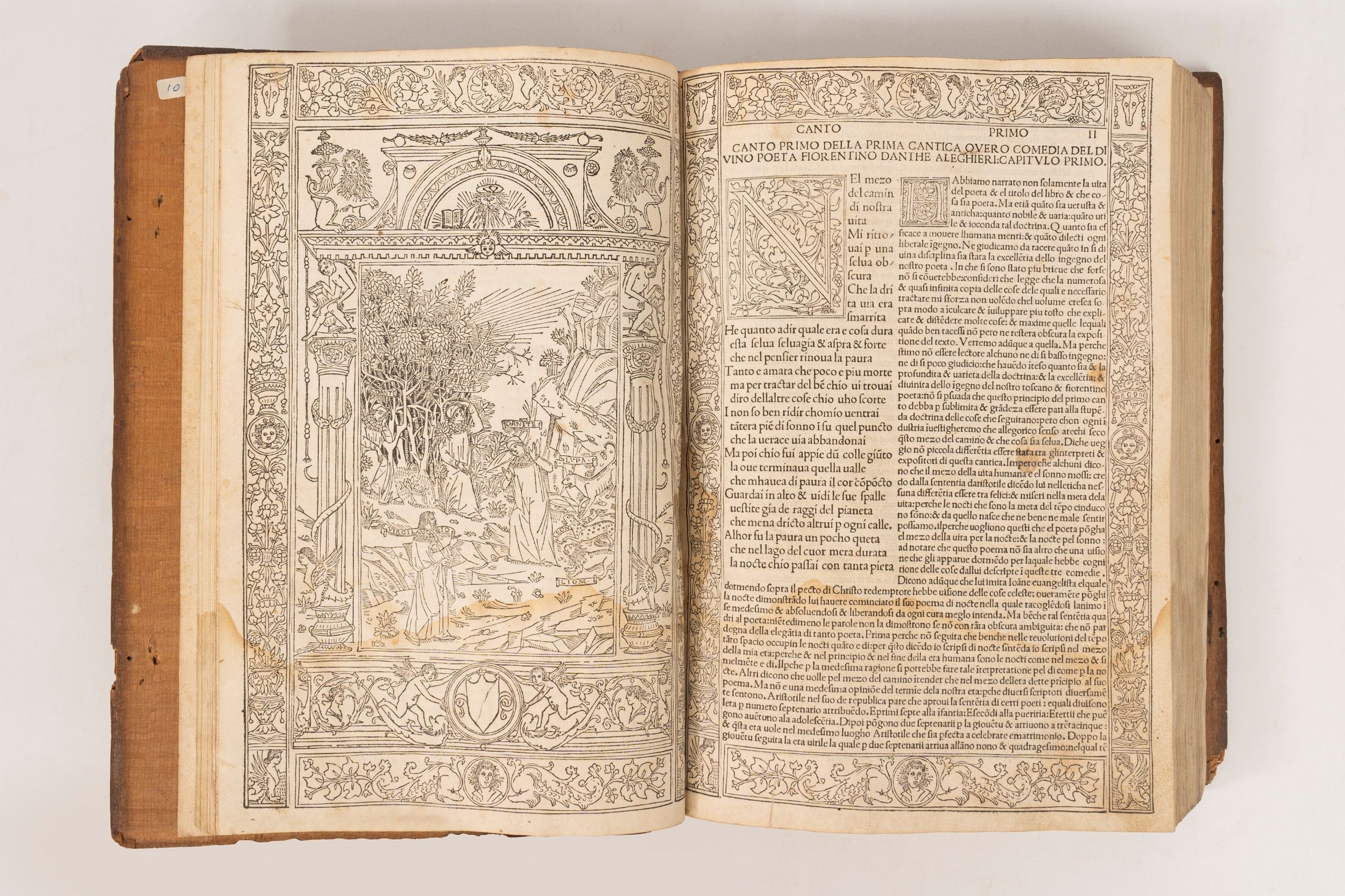 1493 Venezia, Matteo Capcasa (di Codeca), 29 novembre 1493. In 2°. 300 x 205 mm. Spazi per capilettera con letterine-guida e iniziali xilografiche su fondo nero, con 97 vignette piccole 3 grandi legni a piena pagina, uno per ciascuna cantica, quello dell'inferno e la pagina antistante entro bella bordura figurate, la prima identica a quella presente nell'edizione del 1491, la seconda creata appositamente per quest'edizione del 1493, aloni di umidità su molte carte, prevalentemente al margine inferiore, restauri alle ultime due carte, legatura coeva in assi di cipresso e pelle, rifatto il dorso. Ex libris Holland House al contropiatto.