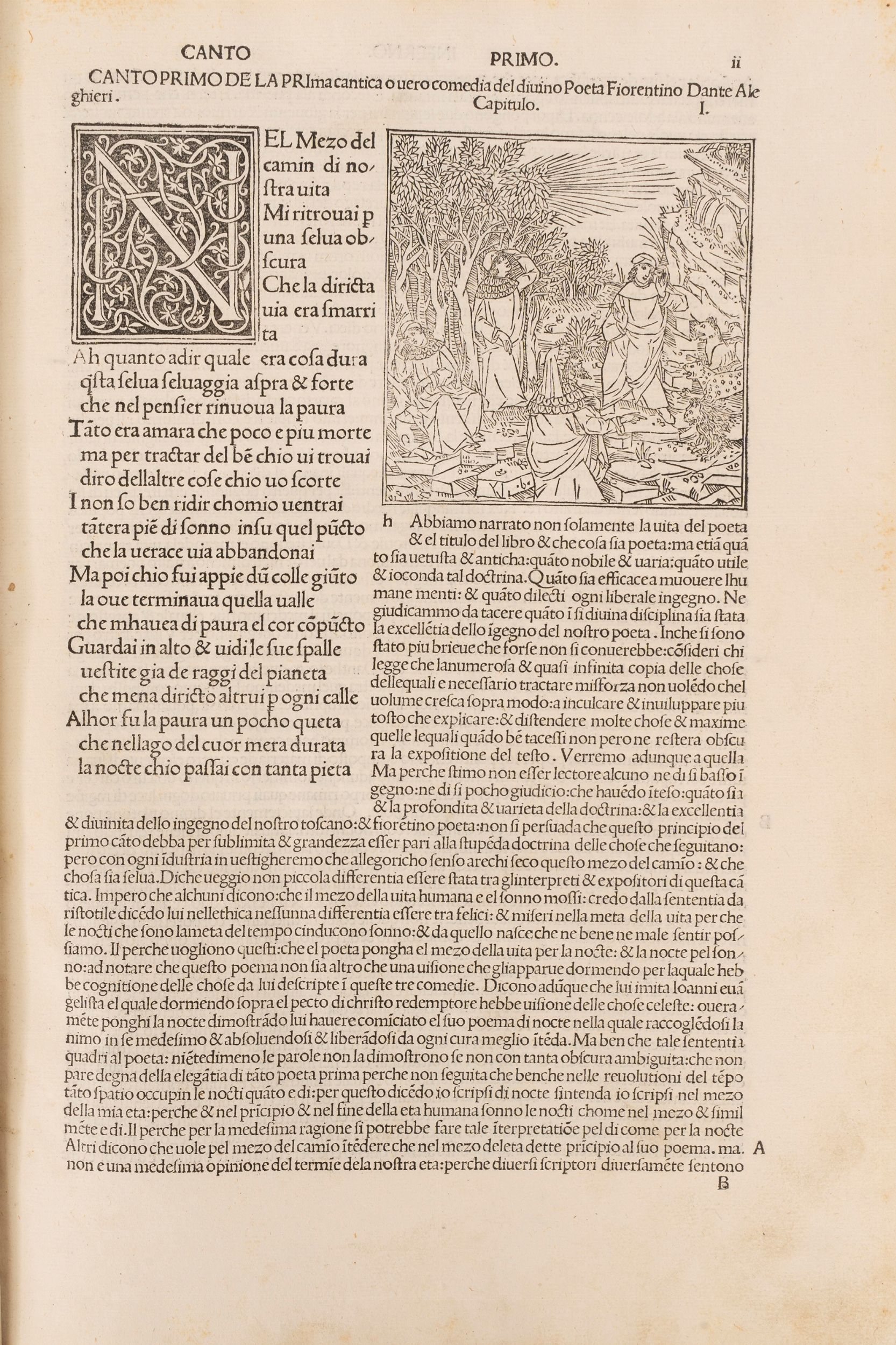 1491 Venezia, Petrus de Plasiis, Cremonensis, 18 novembre 1491. In 2°. 312 x 210 mm. Iniziali xilografiche fiorite a sfondo nero di diverso formato per l'inizio delle cantiche e dei canti e vignette xilografiche all'inizio dei canti, spazi bianchi per le maiuscole con lettere guida nel commento, 100 incisioni in legno storicamente attribuite a Mantegna, lievi fioriture ai margini delle prime carte, foro con perdita di testo alle pp47-48, restauro senza perdita a p.267, legatura del sec.XVIII in piena pergamena e tasselli in oro al dorso col titolo. Ex libris al contropiatto del Barone di Landau.