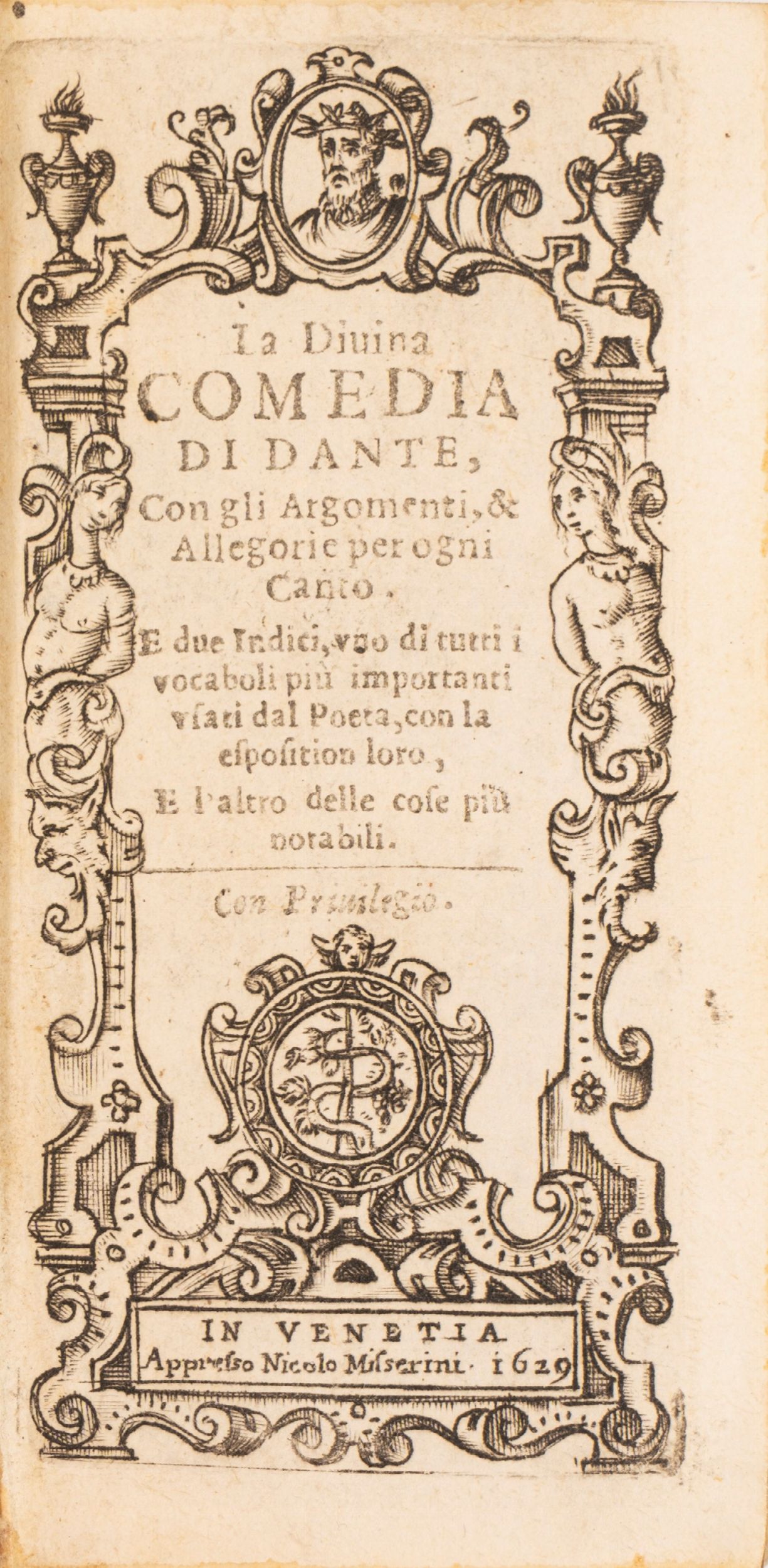 1629 Venezia, appresso Nicolo Misserini, 1629. In 24°. Ritratto di Dante entro cornice elaborata al frontespizio, legatura del sec. XIX in mezza pelle e cartone marmorizzato.