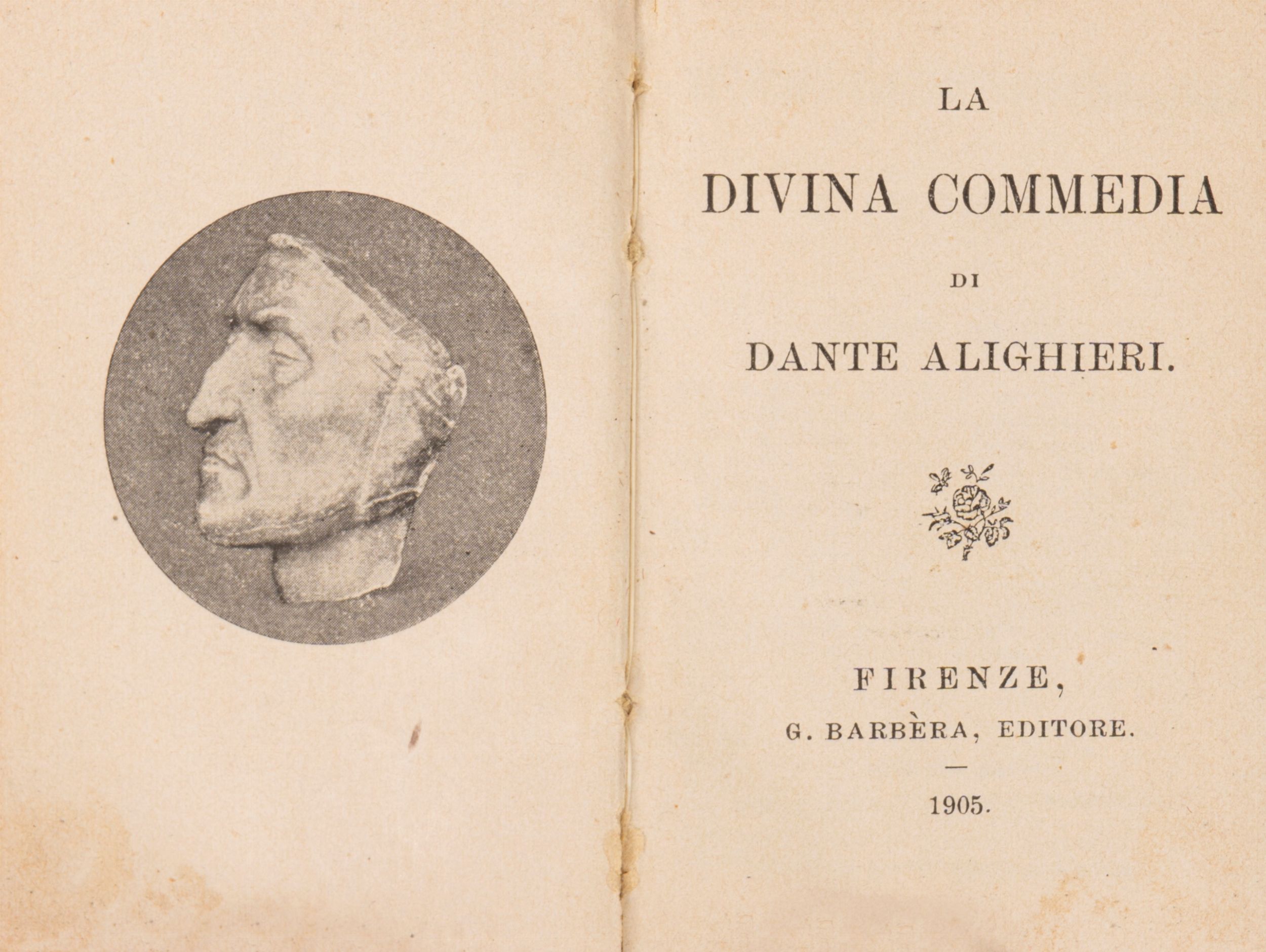 1905 Firenze, Barbera, 1905-1908. In 128°. 64 x 44 mm. Una tavola in antiporta raffigurante la maschera funeraria di Dante, legatura editoriale in pelle con decorazioni in oro. § La Vita nuova e il Canzoniere . Firenze, Barbera, 1908. Insieme nel lotto un esemplare dell'edizione Barbera 1916 della Divina Commedia, stesso formato.