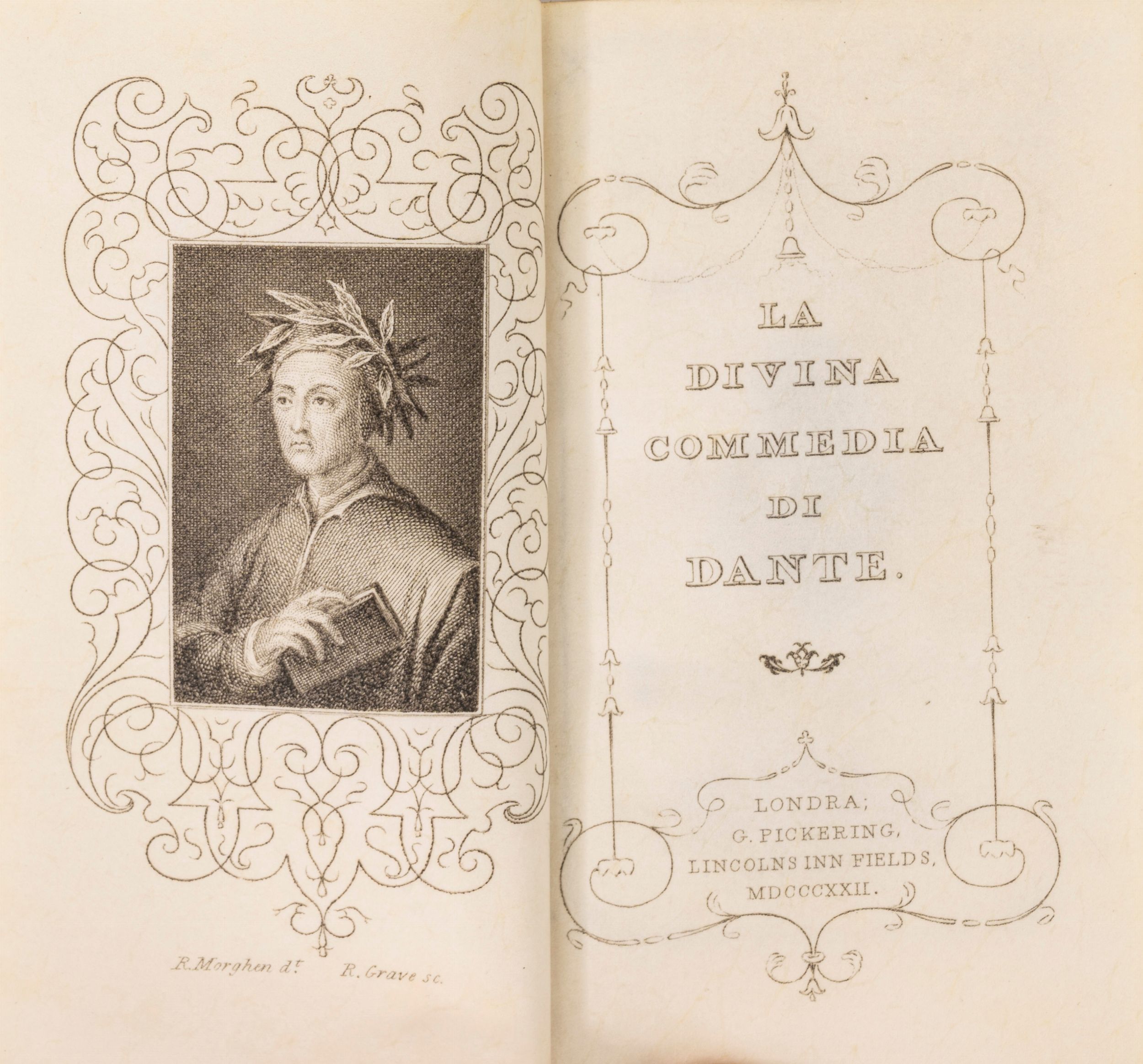 1822 Londra, C.Corrall e G.Pickering, 1822-1823. In 48°. 82 x 46 mm. 2 voll. Ritratto di Dante inciso da Grace su disegno di Morghen, SPLENDIDO ESEMPLARE STAMPATO SU PERGAMENA (n.2 di 6), raffinata legatura da amatore in pieno marocchino blu con cornici dorate ai piatti e decorazioni in oro al dorso, tagli dorati.