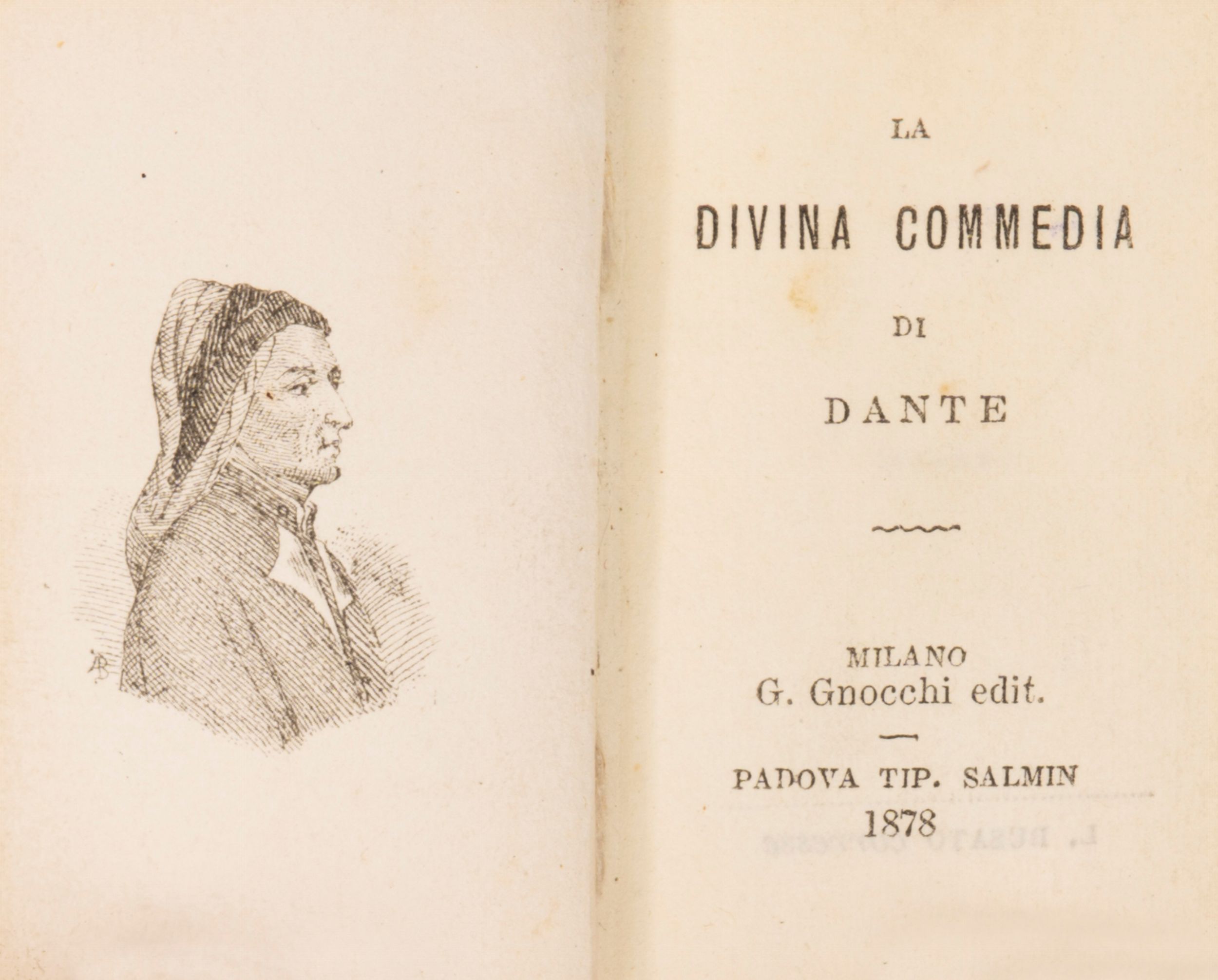 1878 Milano, G. Gnocchi - Padova, Tip. Salmin 1878. In 128°. 50 x 32 mm. Ritratto di Dante in antiporta, splendida legatura coeva in marocchino blu con decorazioni in oro ai piatti e al dorso, tagli rossi. § [ Cesare Fenini ]. Galleria Dantesca microscopica . 30 fotografie dei disegni di Scaramuzza . Milano, Hoepli, 1880. In 128°. Titolo stampato in inchiostro rosso e nero. Con 30 fotografie montate su carta riproducenti disegni di Scaramuzza. Legatura coeva in zigrino blu con decorazioni in oro, tagli rossi.