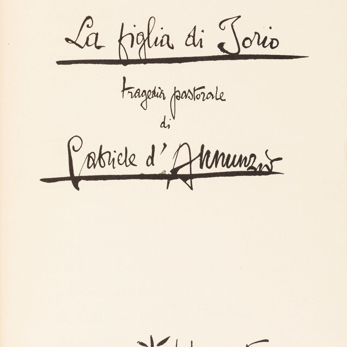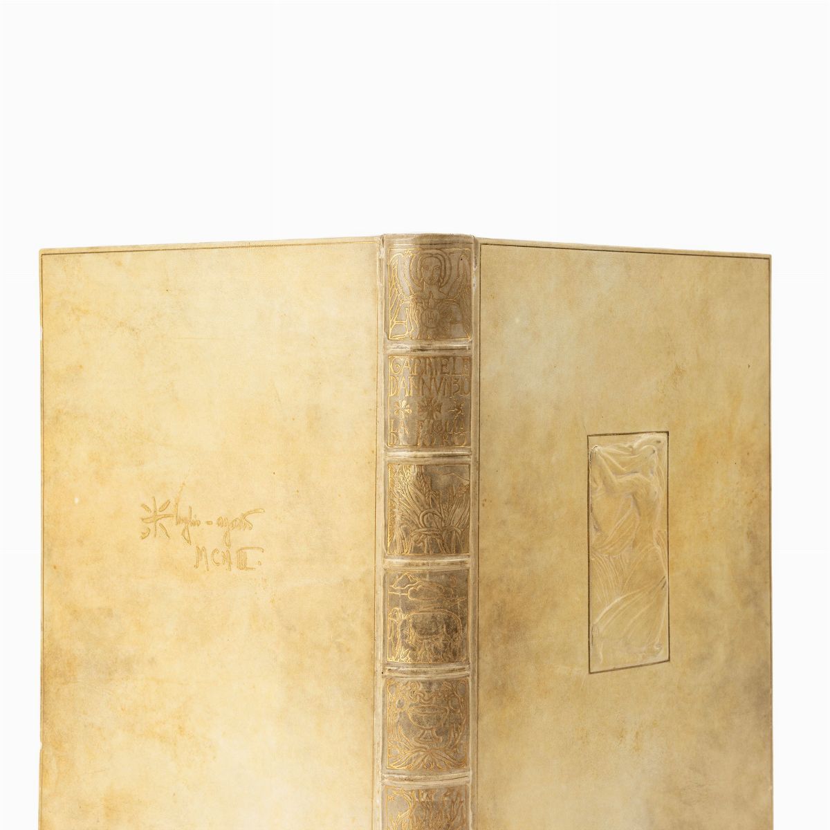 1937 Milano : E. Bestetti editore d'arte, 1937. In 2°. 355 x 265 mm. Riproduzione integrale del manoscritto, datato 29 agosto 1903, donato a Michetti (come si legge da un'acclusa lettera di d'Annunzio riprodotta), legatura in piena pergamena rigida con una placca in bassorilievo al centro del piatto superiore raffigurante la figlia di Iorio, custodia editoriale in cartone.