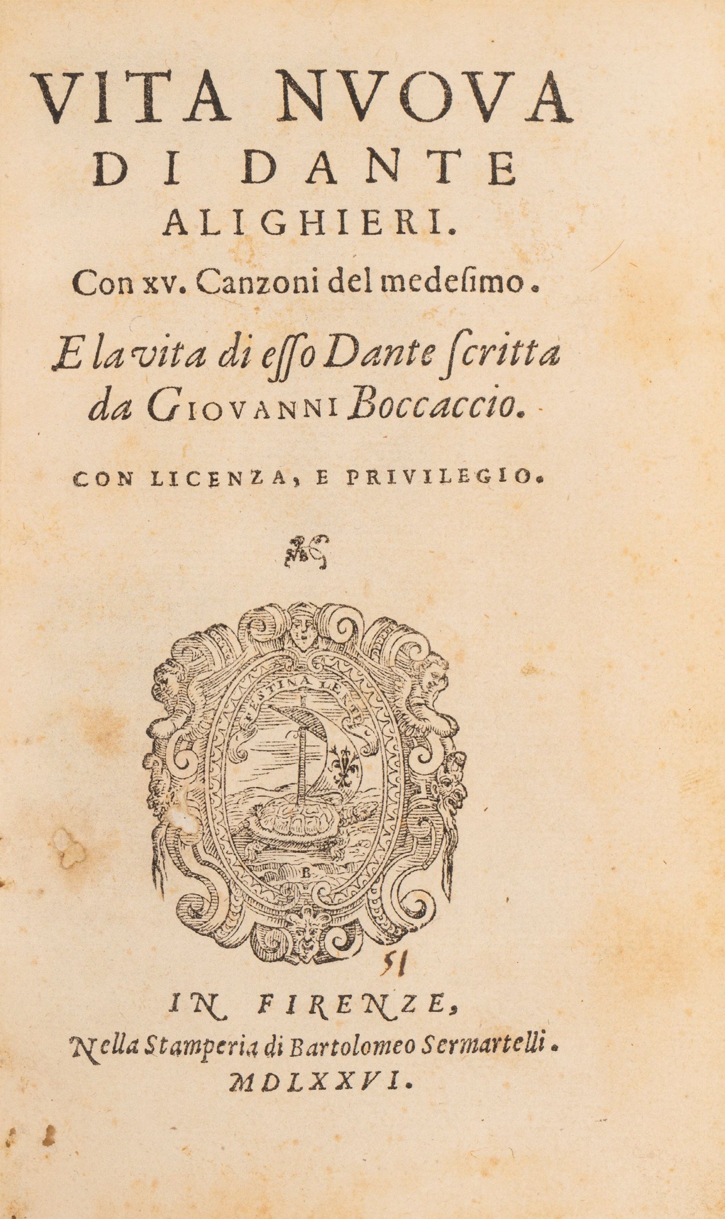 1576 Firenze, nella stamperia di Bartolomeo Sermartelli, 1576. In 8°. Marca del Sermartelli al frontespizio, tartaruga che tiene sul guscio una vela con giglio fiorentino. In cornice figurata Festina lente, perfetto esemplare conservato in una splendida legatura da bibliofilo in marocchino rosso con impressioni in oro ai piatti e al dorso, firmata R A 1902. Ex libris al contropiatto di C. H. St. John Hornby